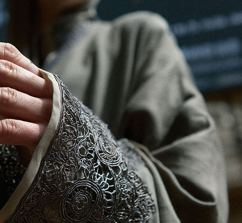 كريستالات سواروفسكي وبريسيوزا، إلى جانب الحرير، القطن، صوف الكشمير، الكريب، والجلد المختار بعناية، تضيف لكل قطعة لمسة من الرقي والعمق.