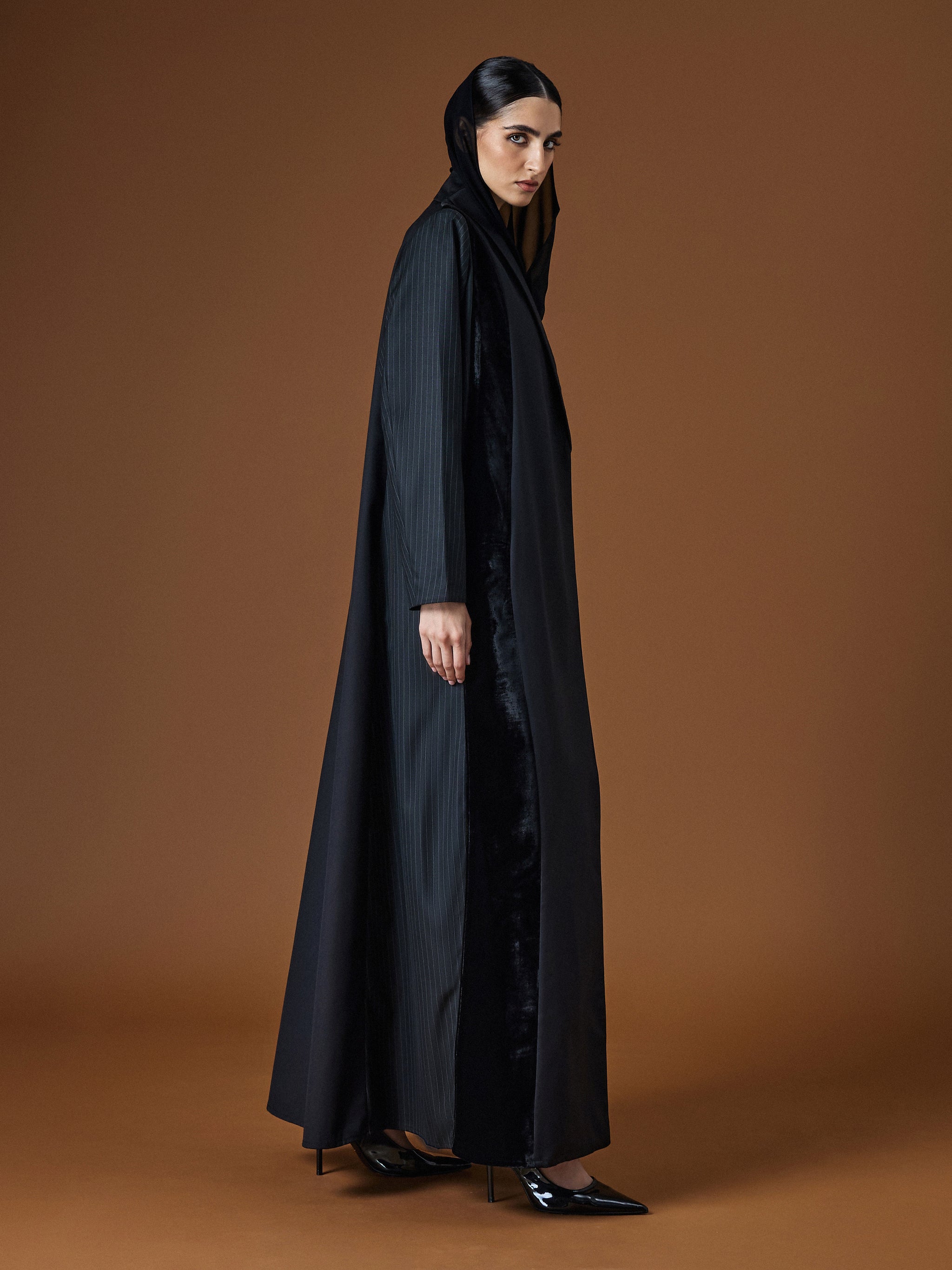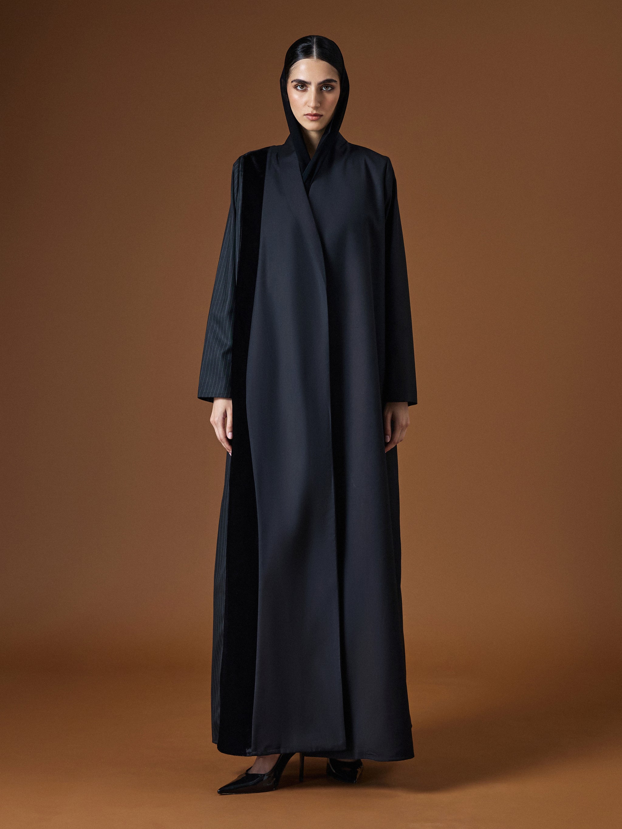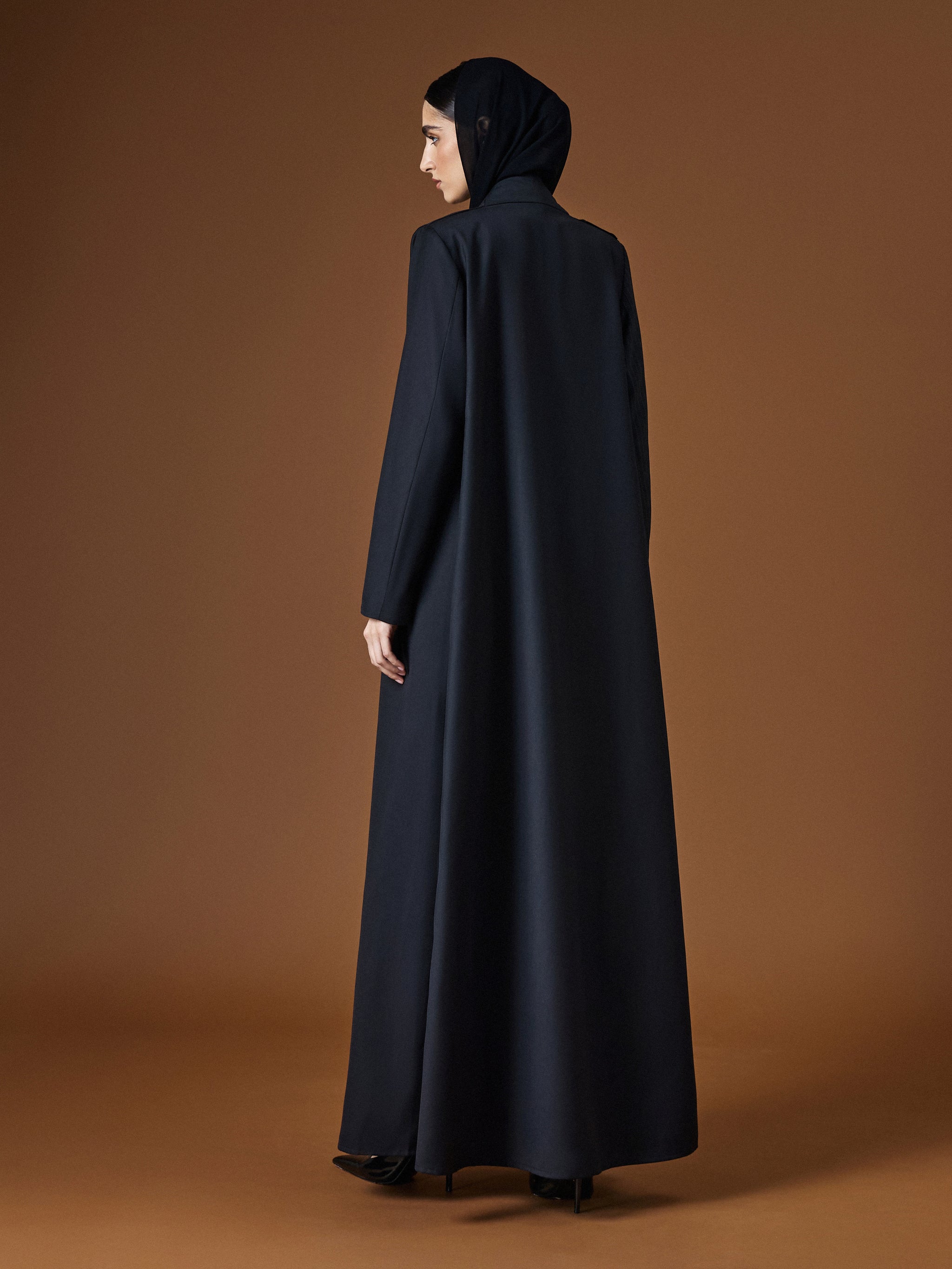 A black abaya in suiting material with AK-06 cut, defined by sleek tailoring and subtle contrasts for modern sophistication.