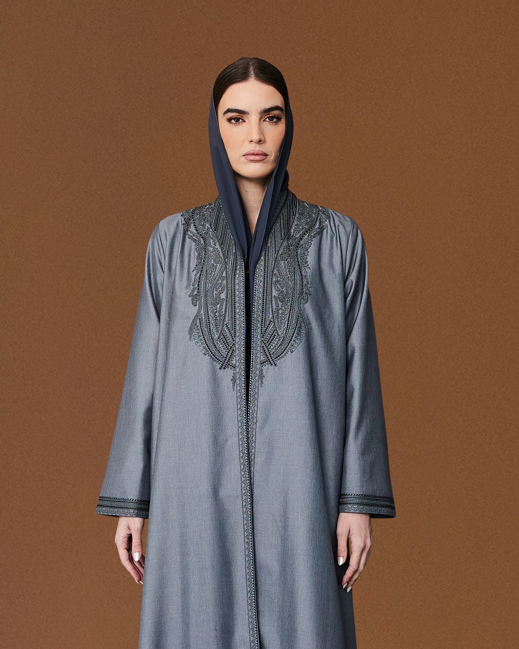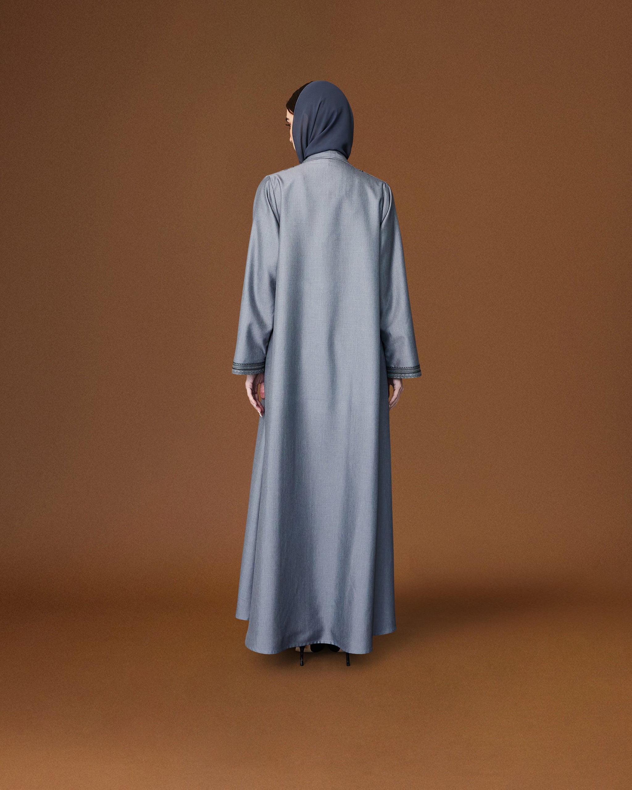 A timeless abaya in a soft grey tone, reflecting quiet elegance and modern simplicity. Designed with a fluid drape and clean silhouette, it offers effortless comfort and a serene, sophisticated look for everyday and special wear.