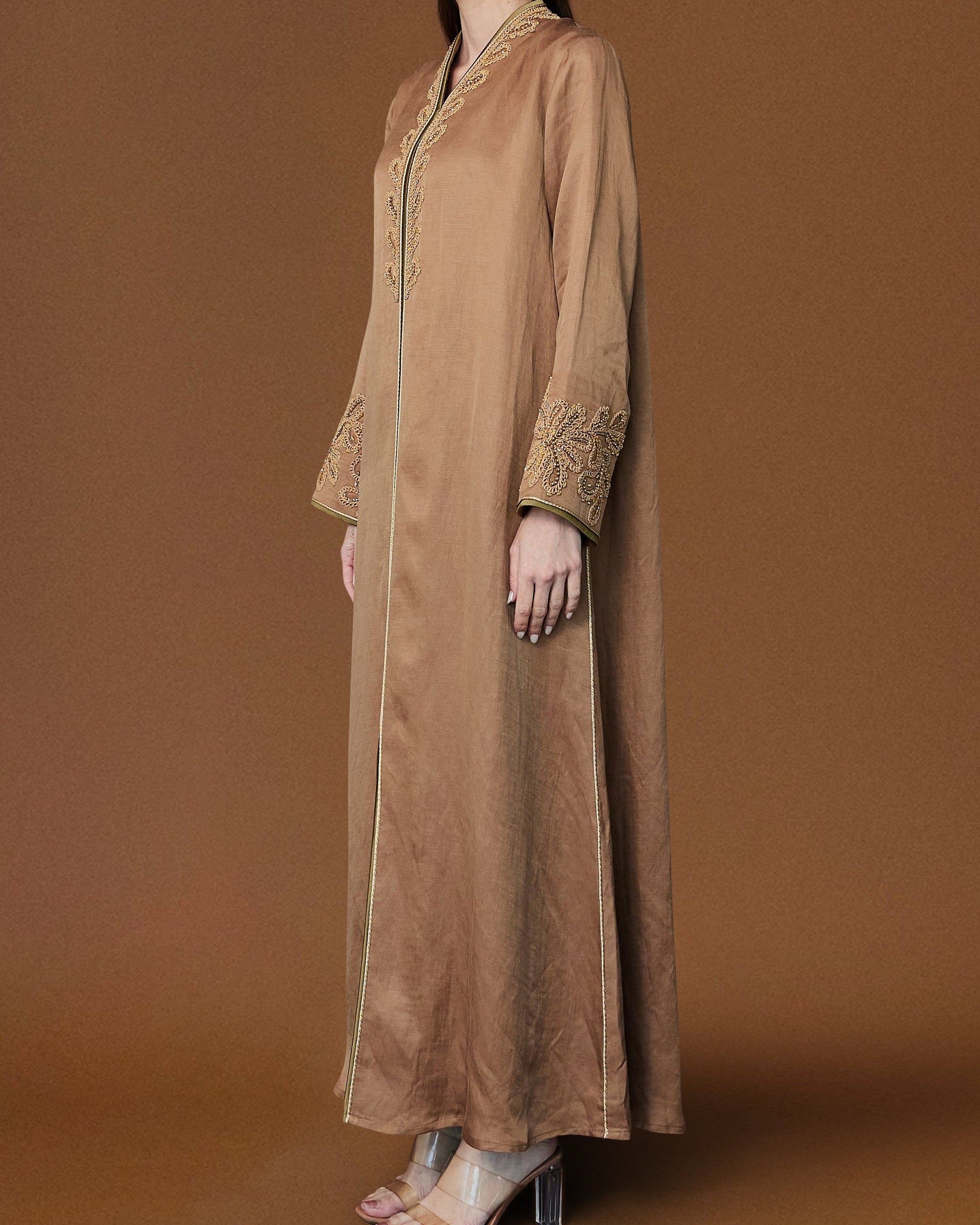 An elegant jalabiya featuring refined golden embellishments inspired by the timeless beauty of palm motifs. Designed for effortless grace and comfort, it offers a luxurious silhouette perfect for special occasions and evening wear. A classic piece that blends tradition with modern sophistication.