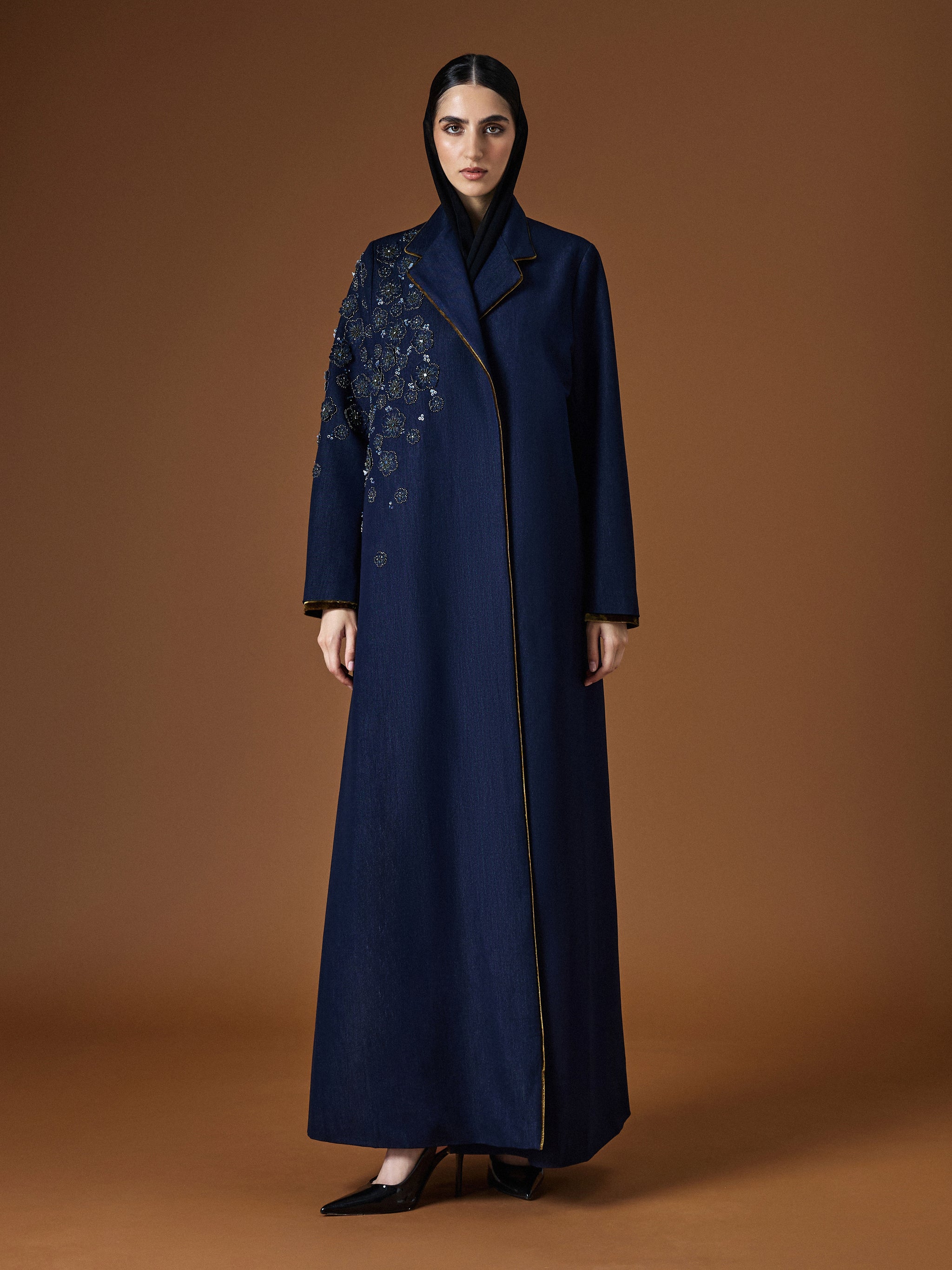 A denim blue abaya in AK-06 cut, enriched with delicate floral embroidery that blends casual charm with refined elegance.