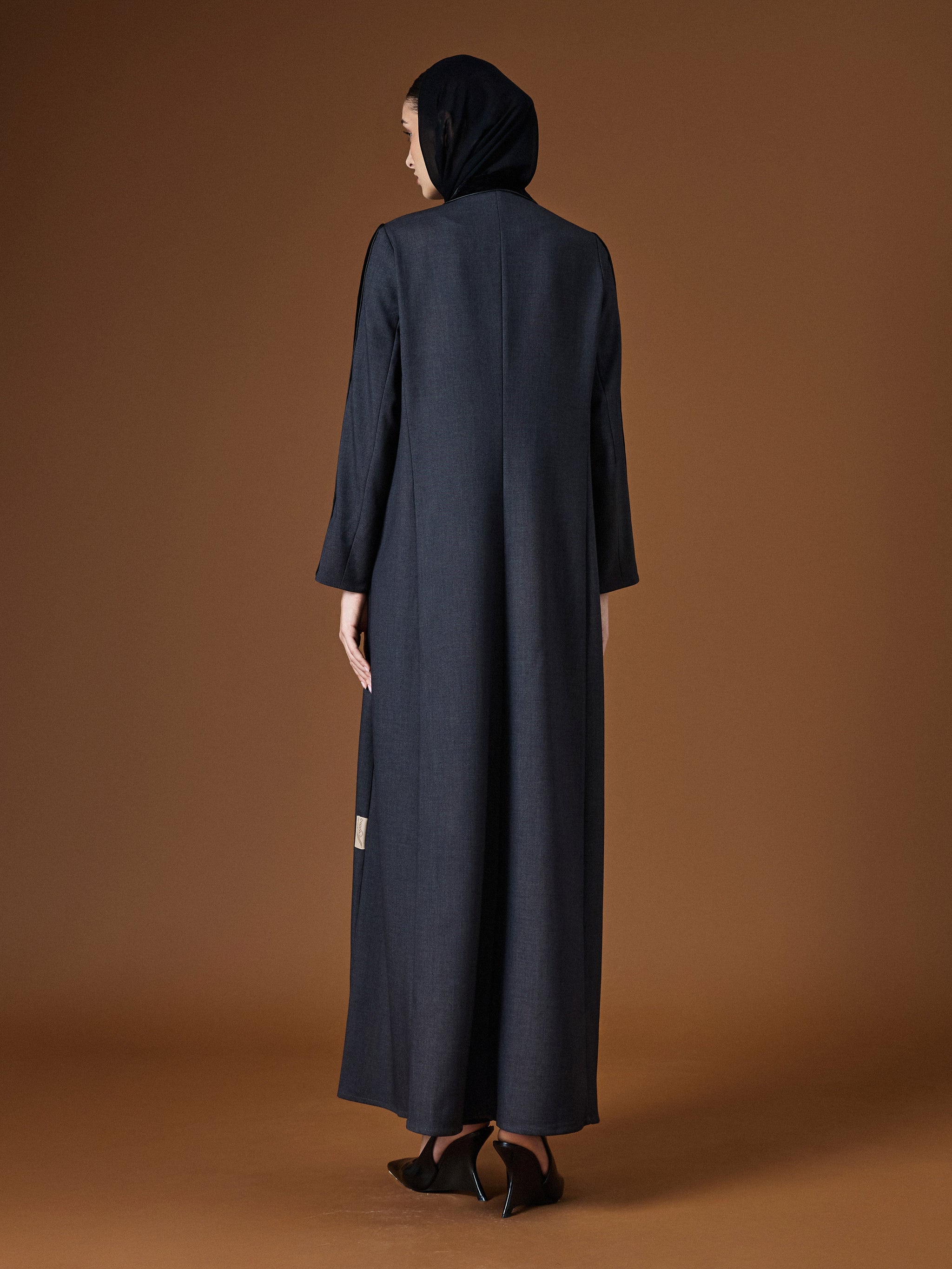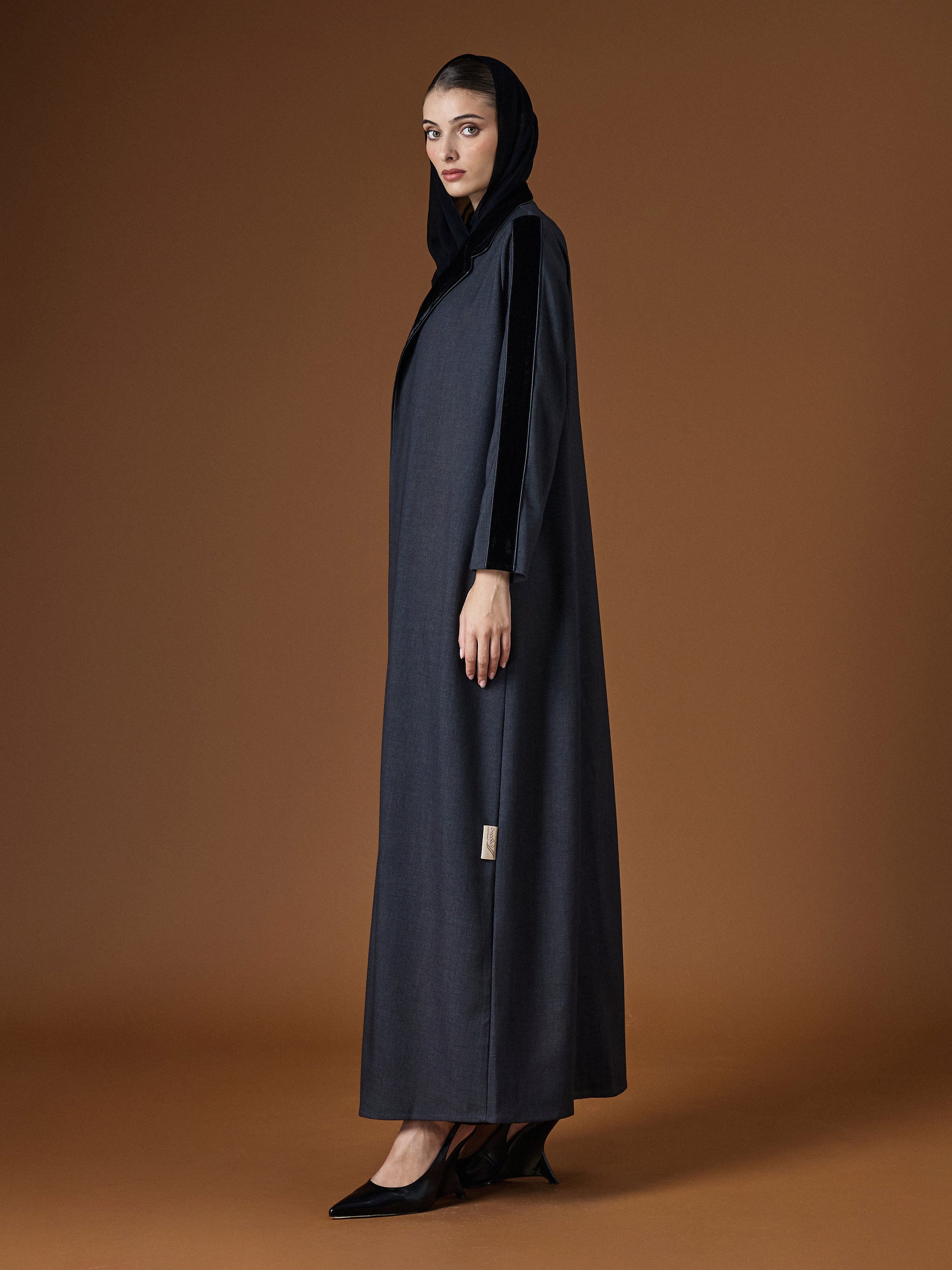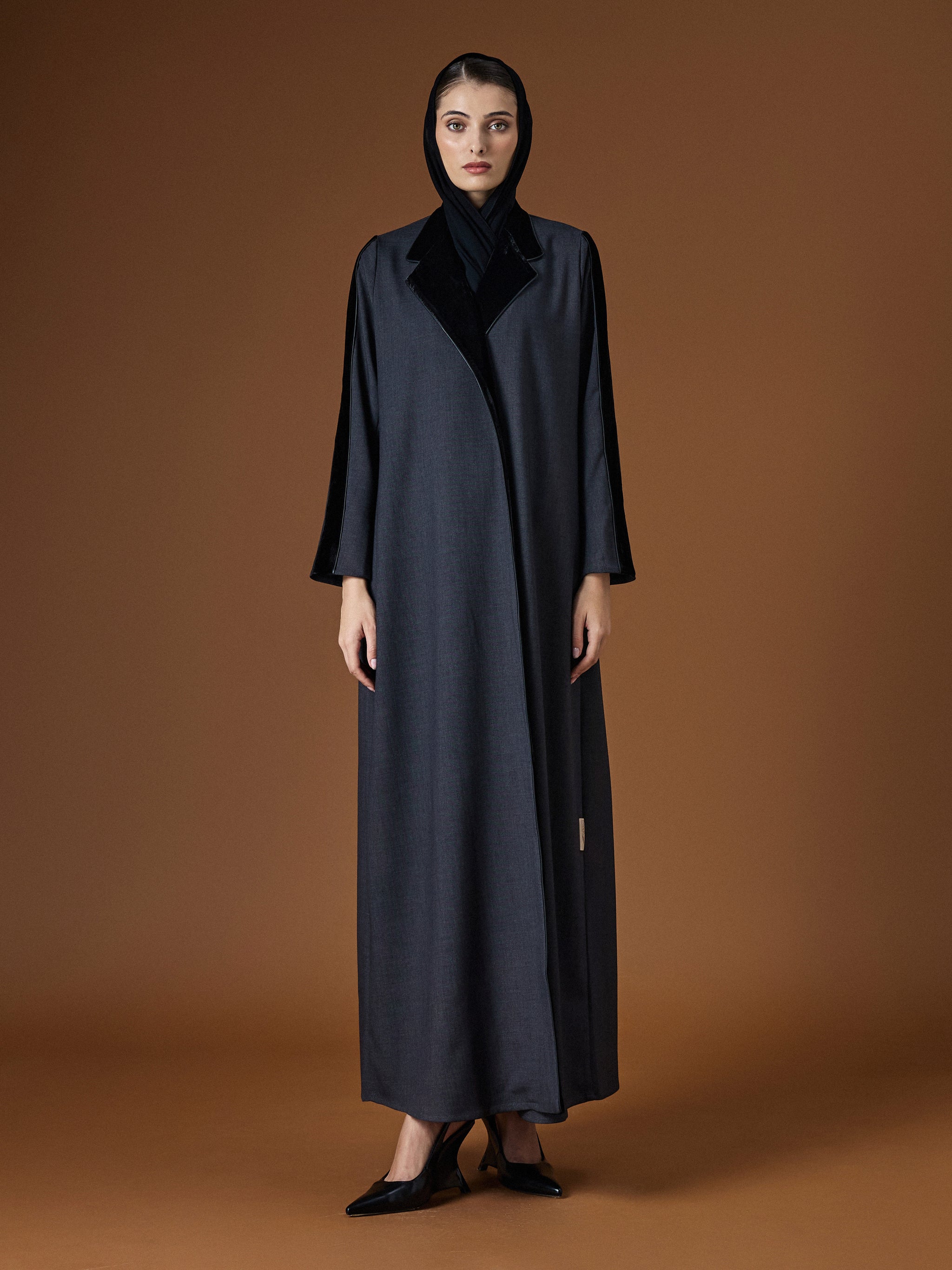 A refined AK-05 cut abaya in dark gray tweel, elevated with black lapel detailing and subtle structured tailoring, embodying modern sophistication with a timeless edge.