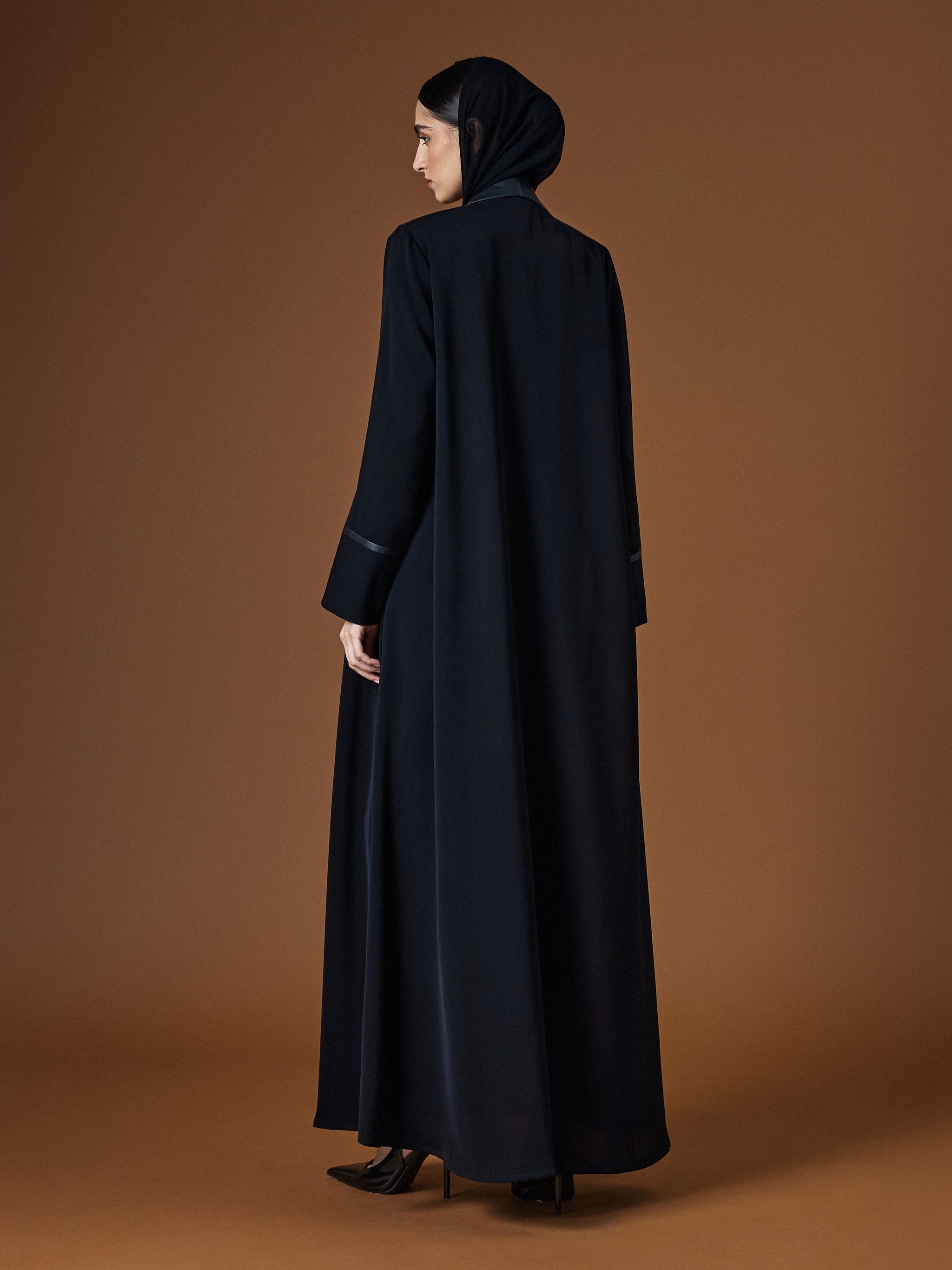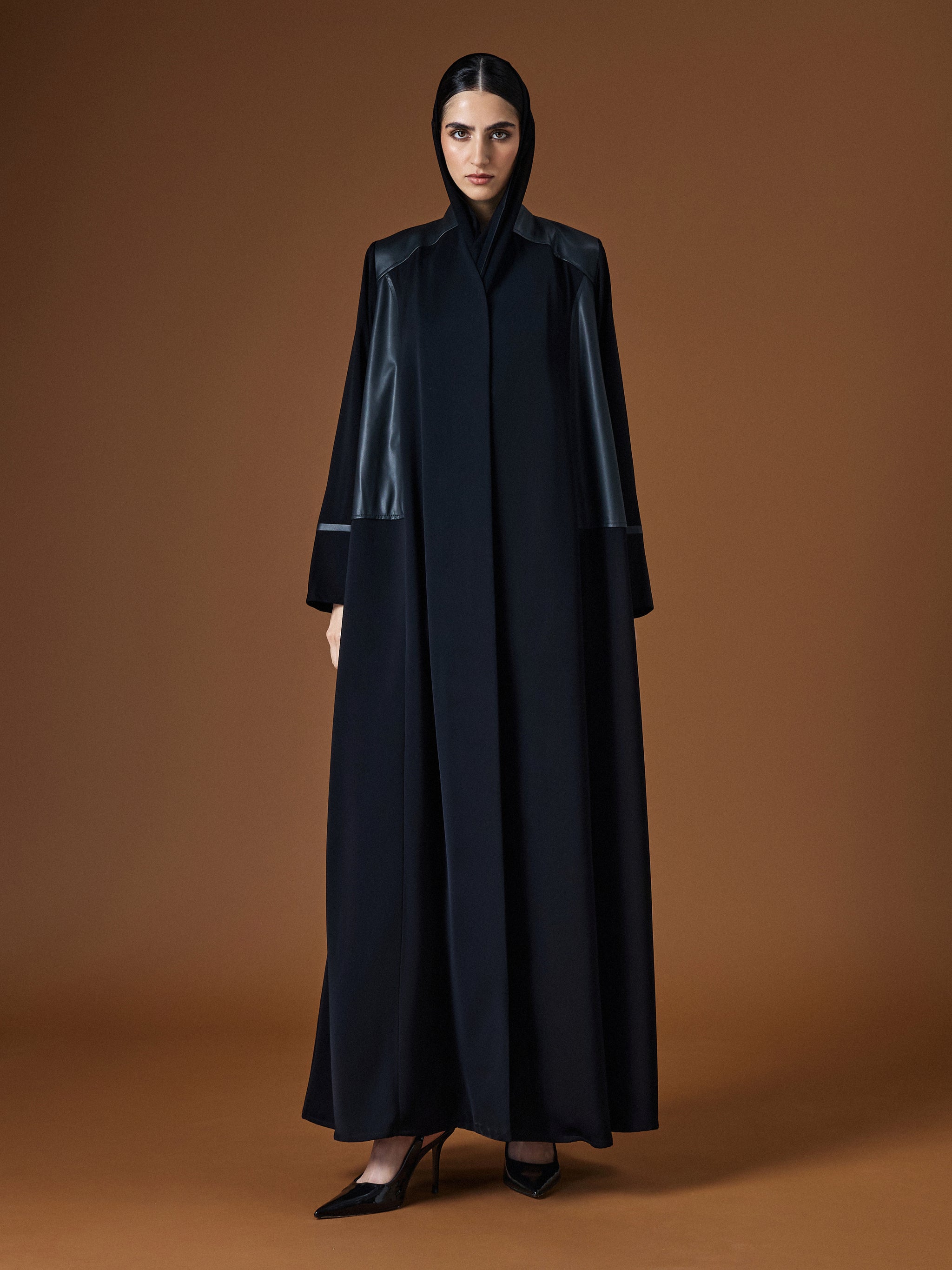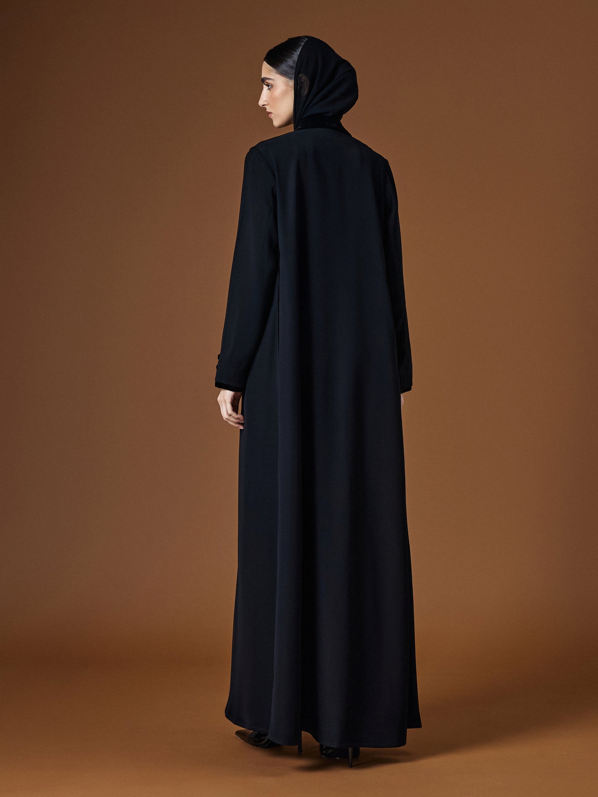 A black crepe abaya in AK-02 cut, defined by its fluid drape and understated elegance, embodying quiet strength and timeless allure.