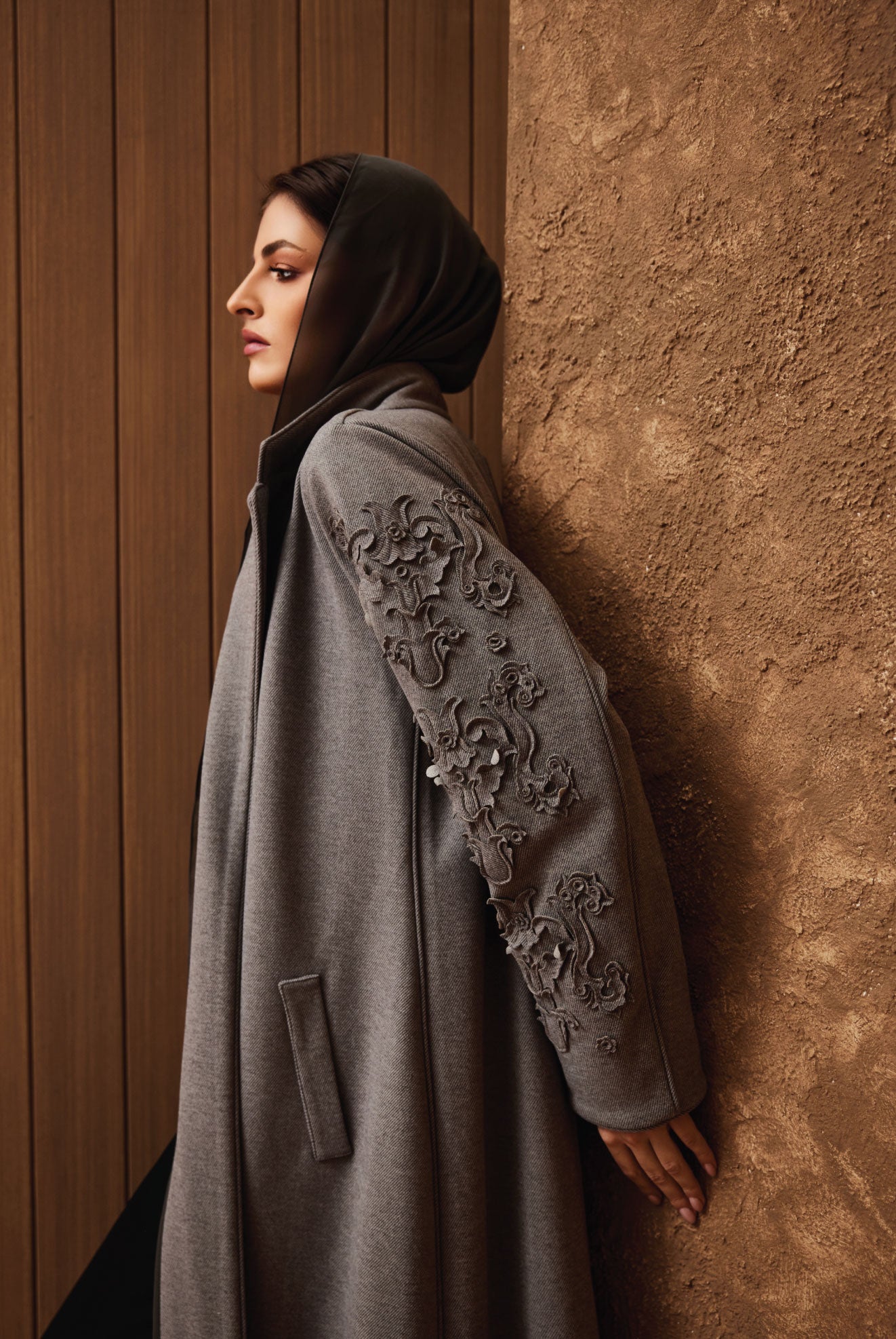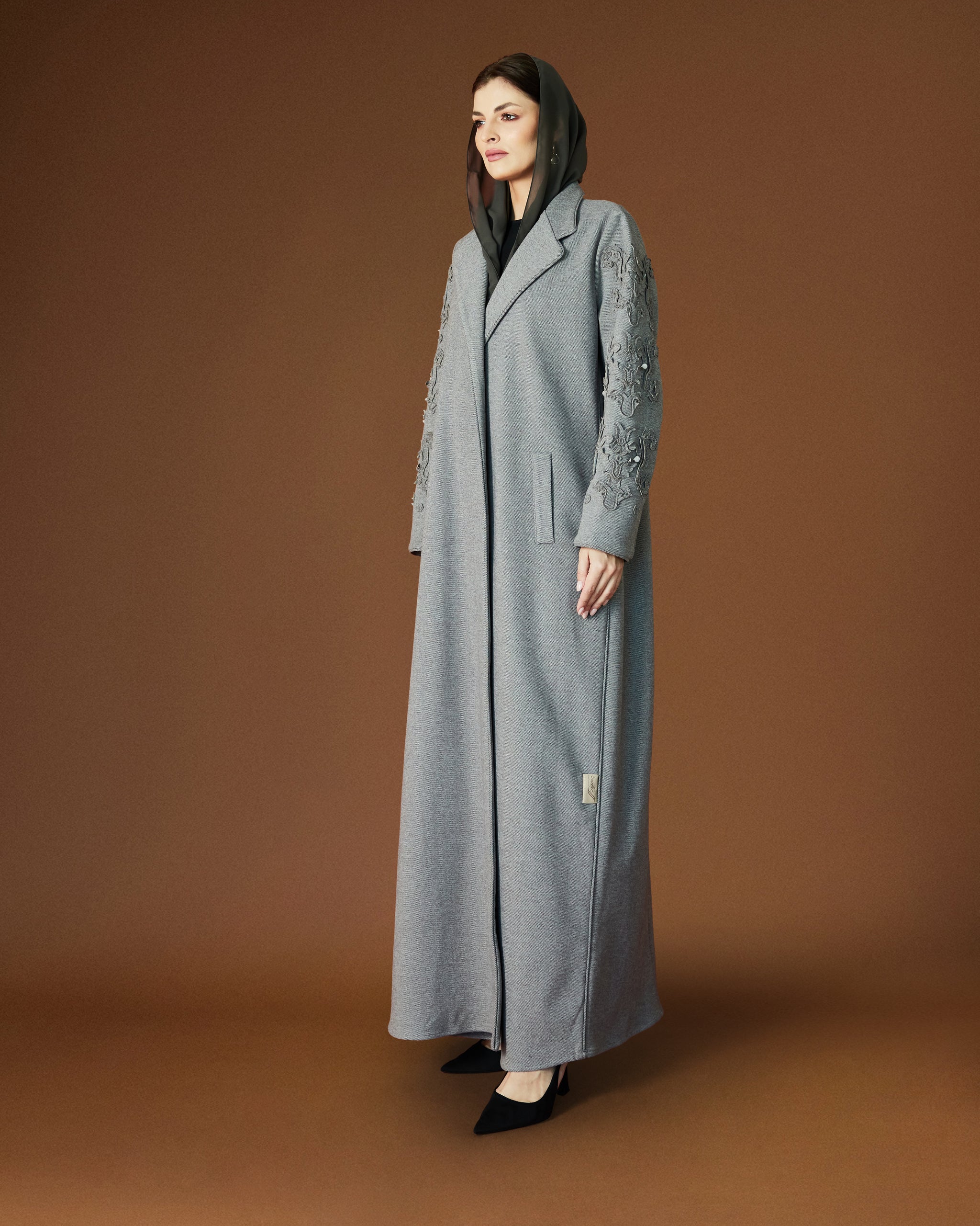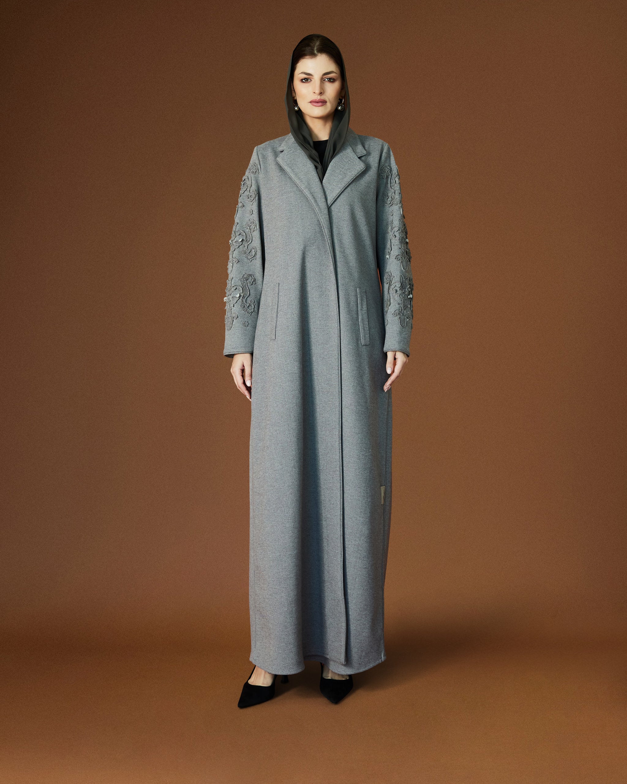 Soft cashmere tailored in our AK-05 cut, featuring delicate sleeve embroidery for refined winter elegance