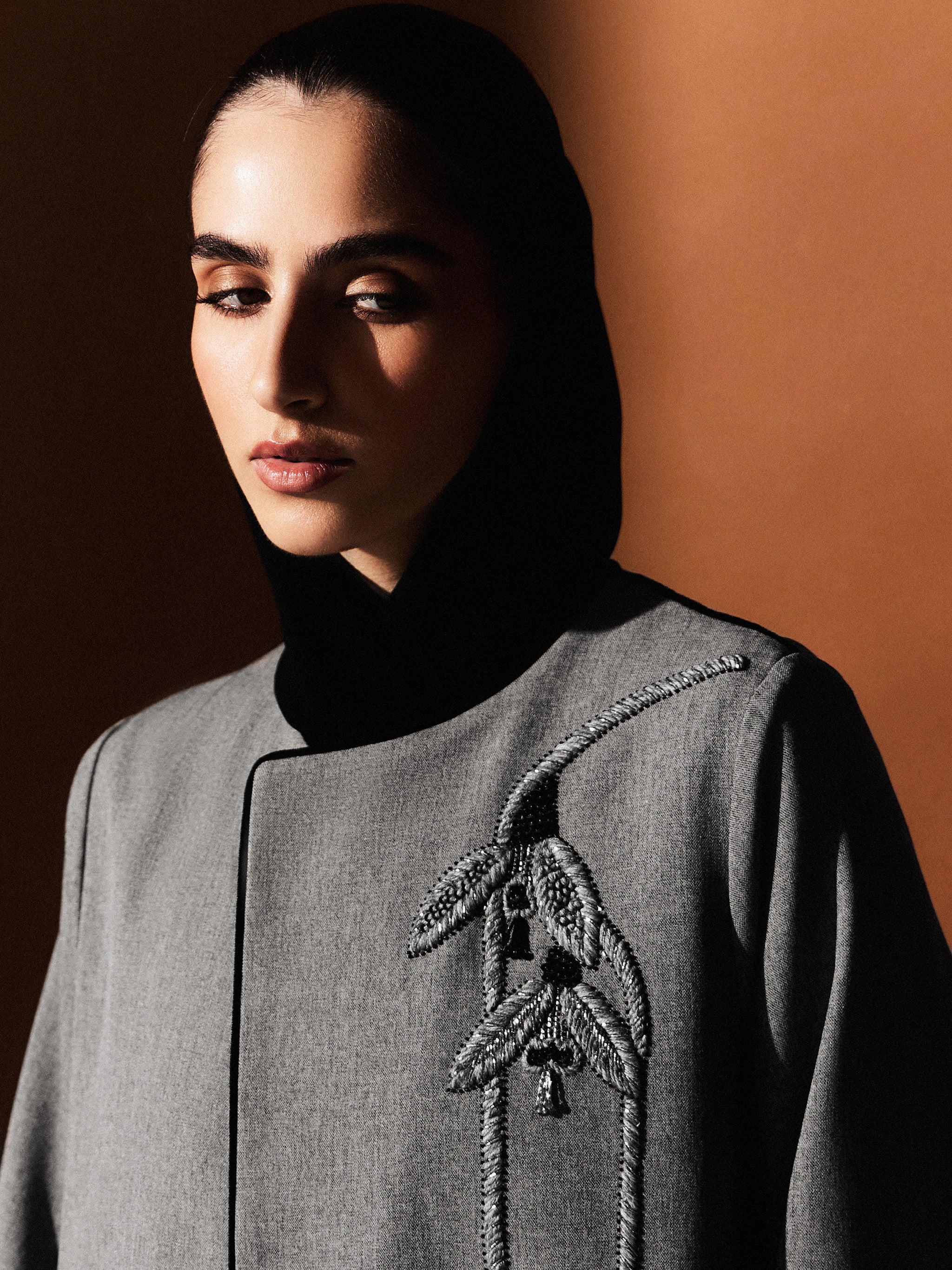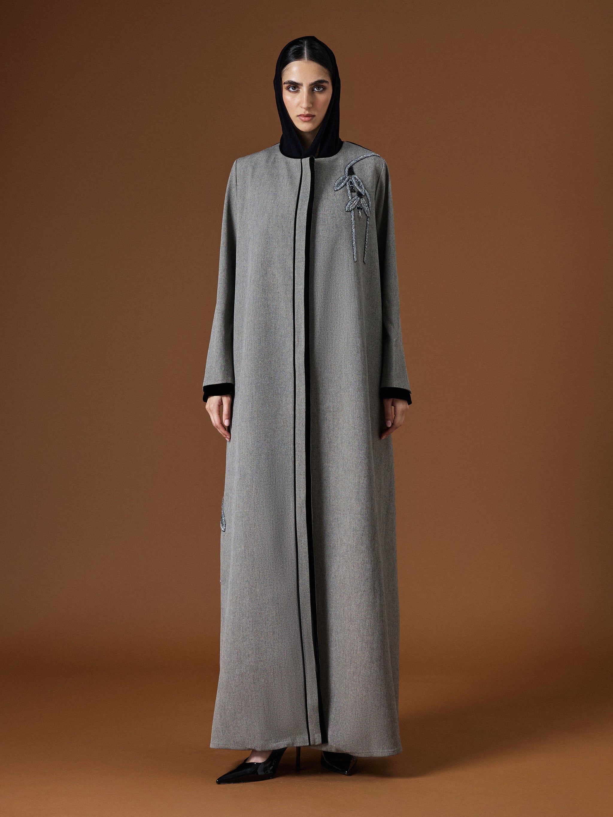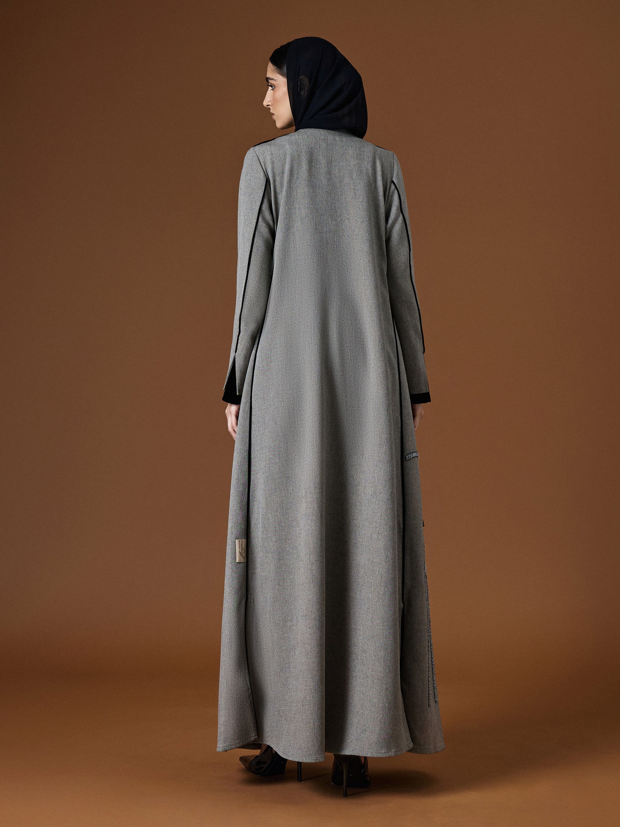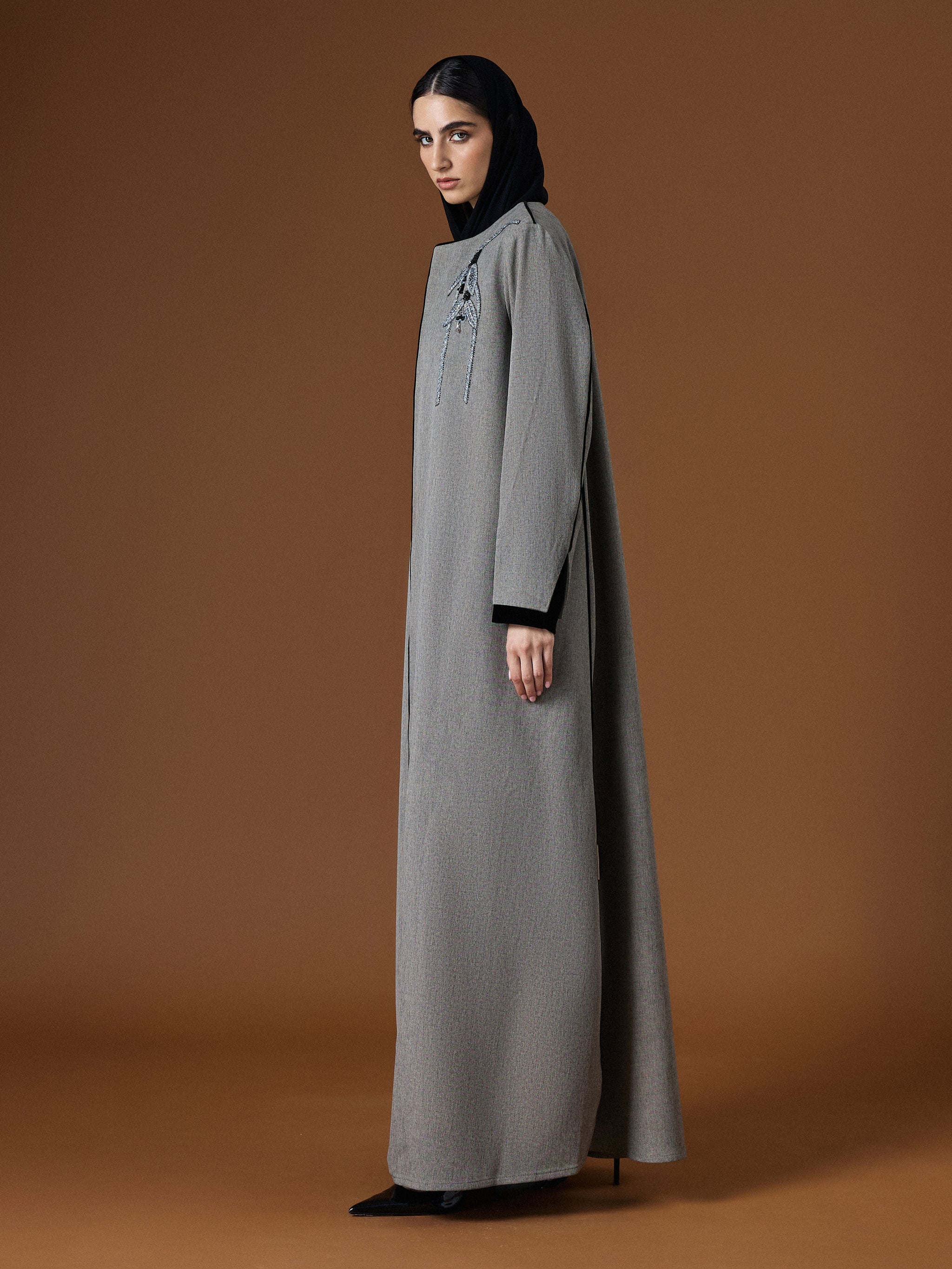 A gray twill abaya in AK-06 cut, highlighted with sleek lines and subtle detailing for a look of quiet sophistication.