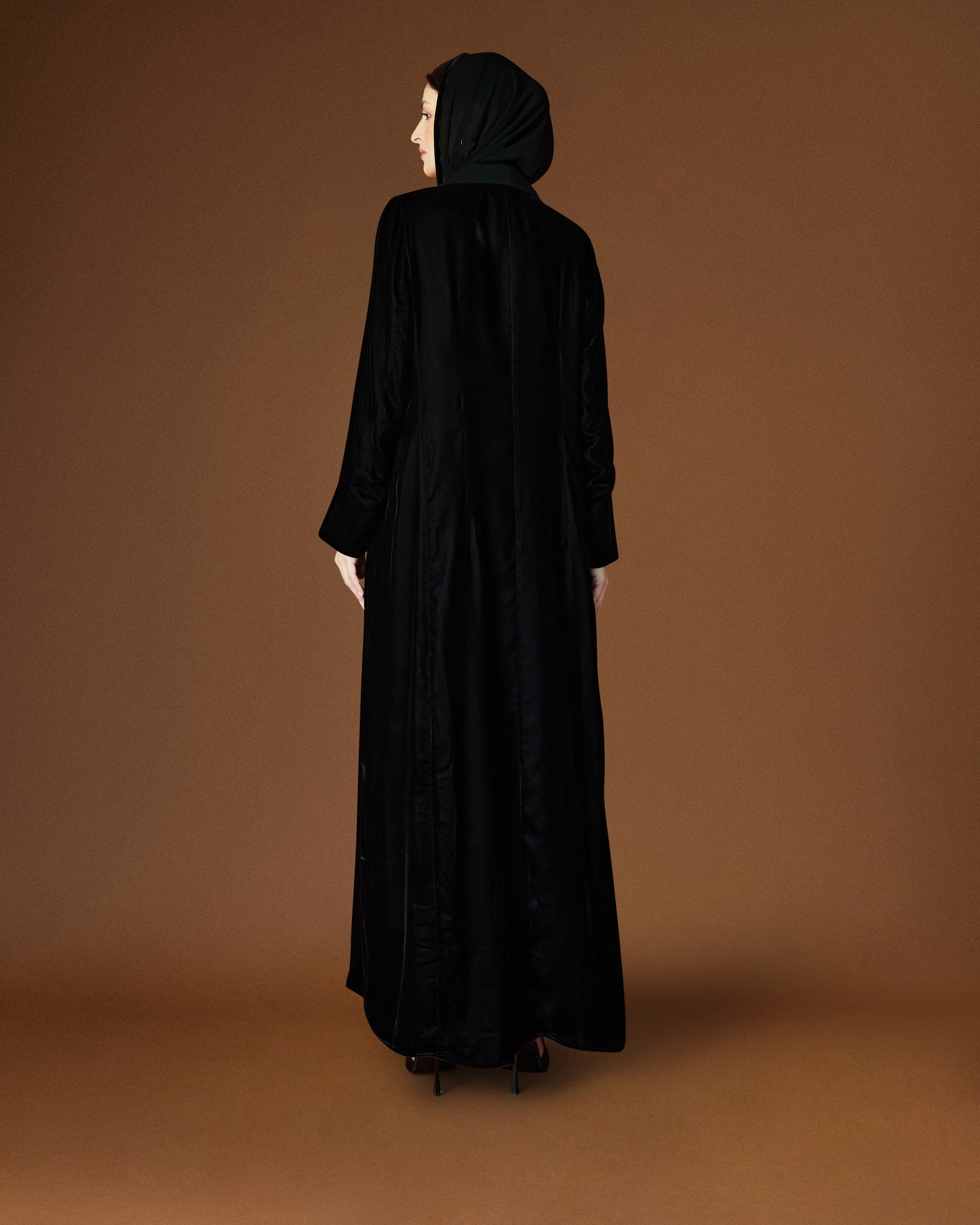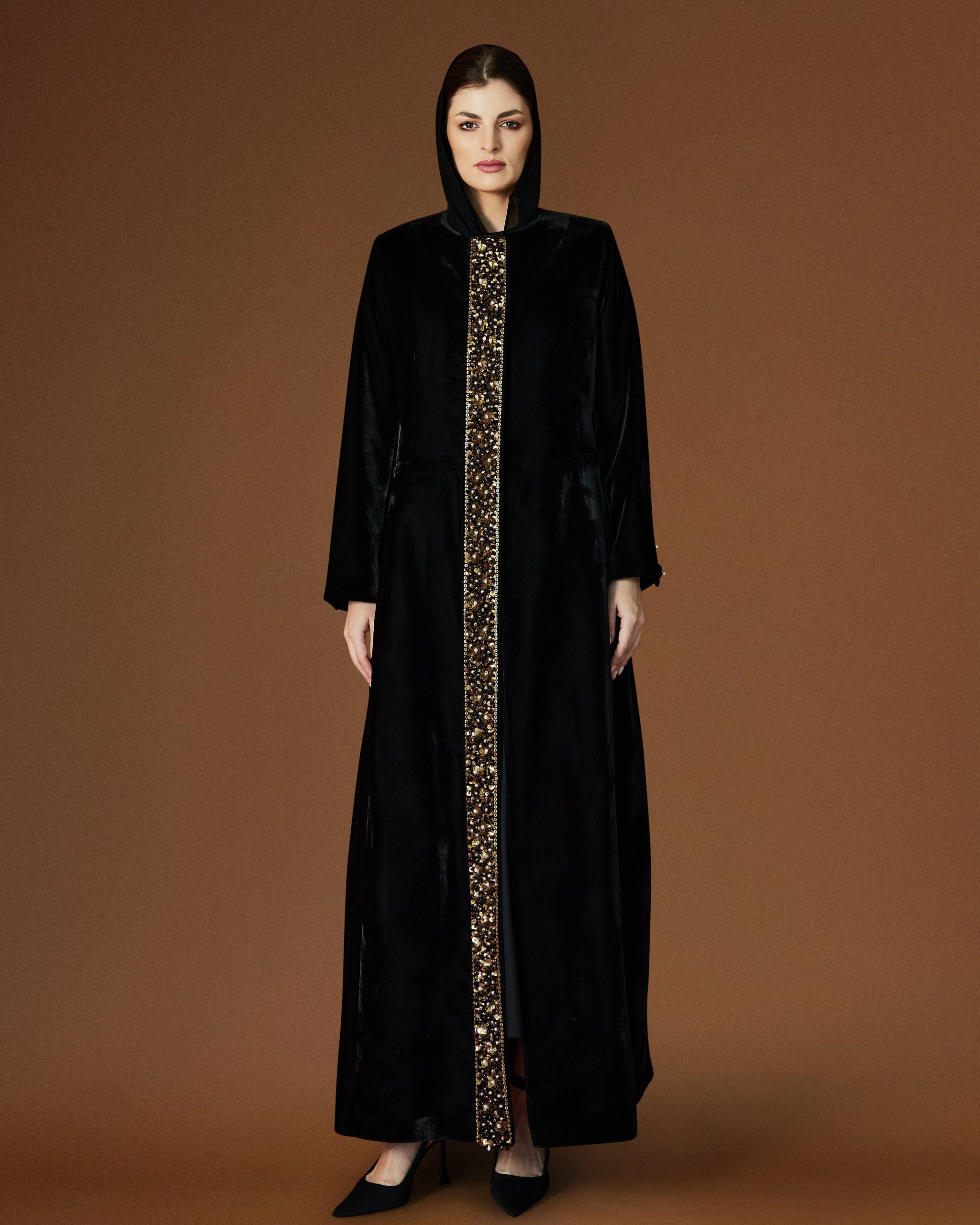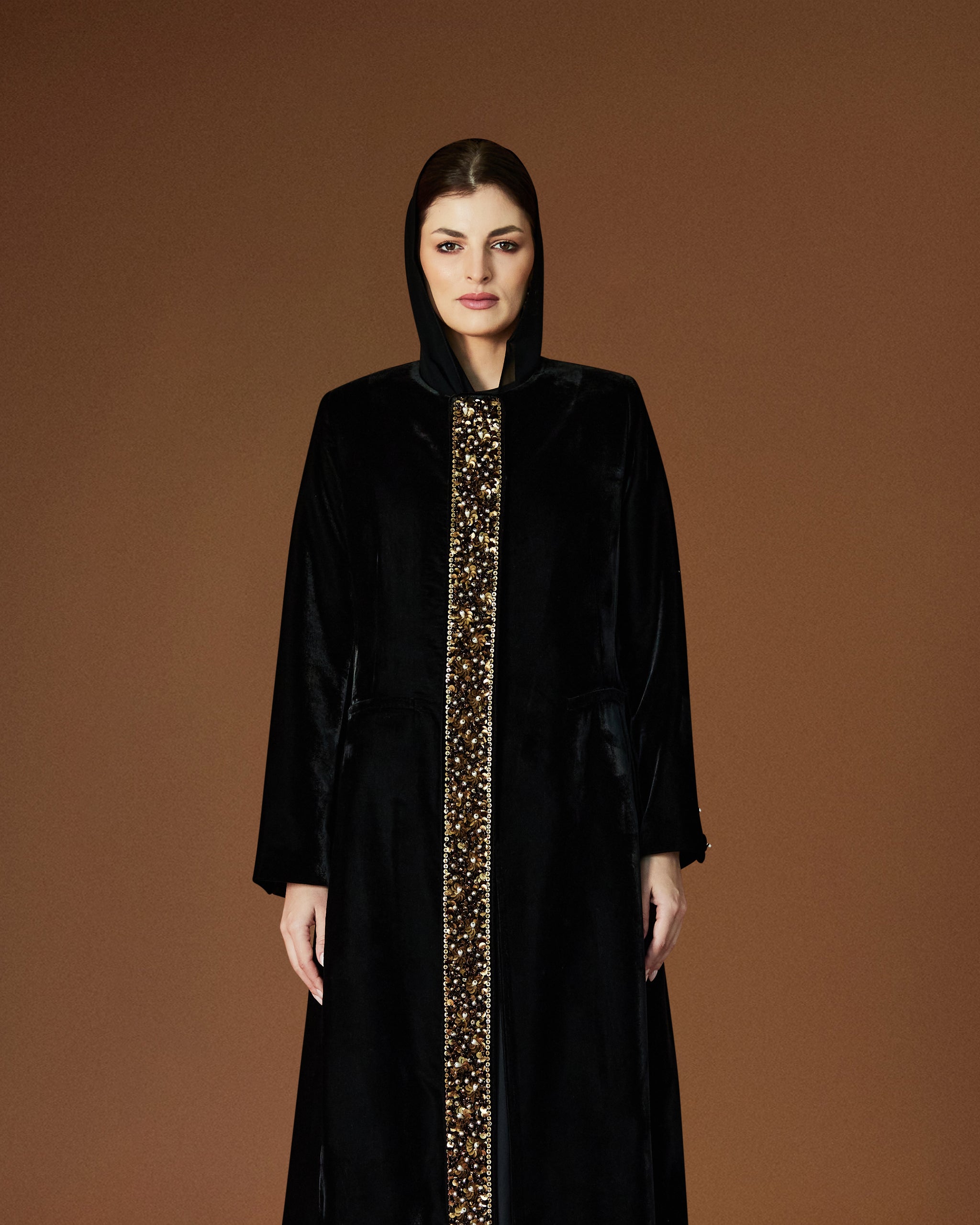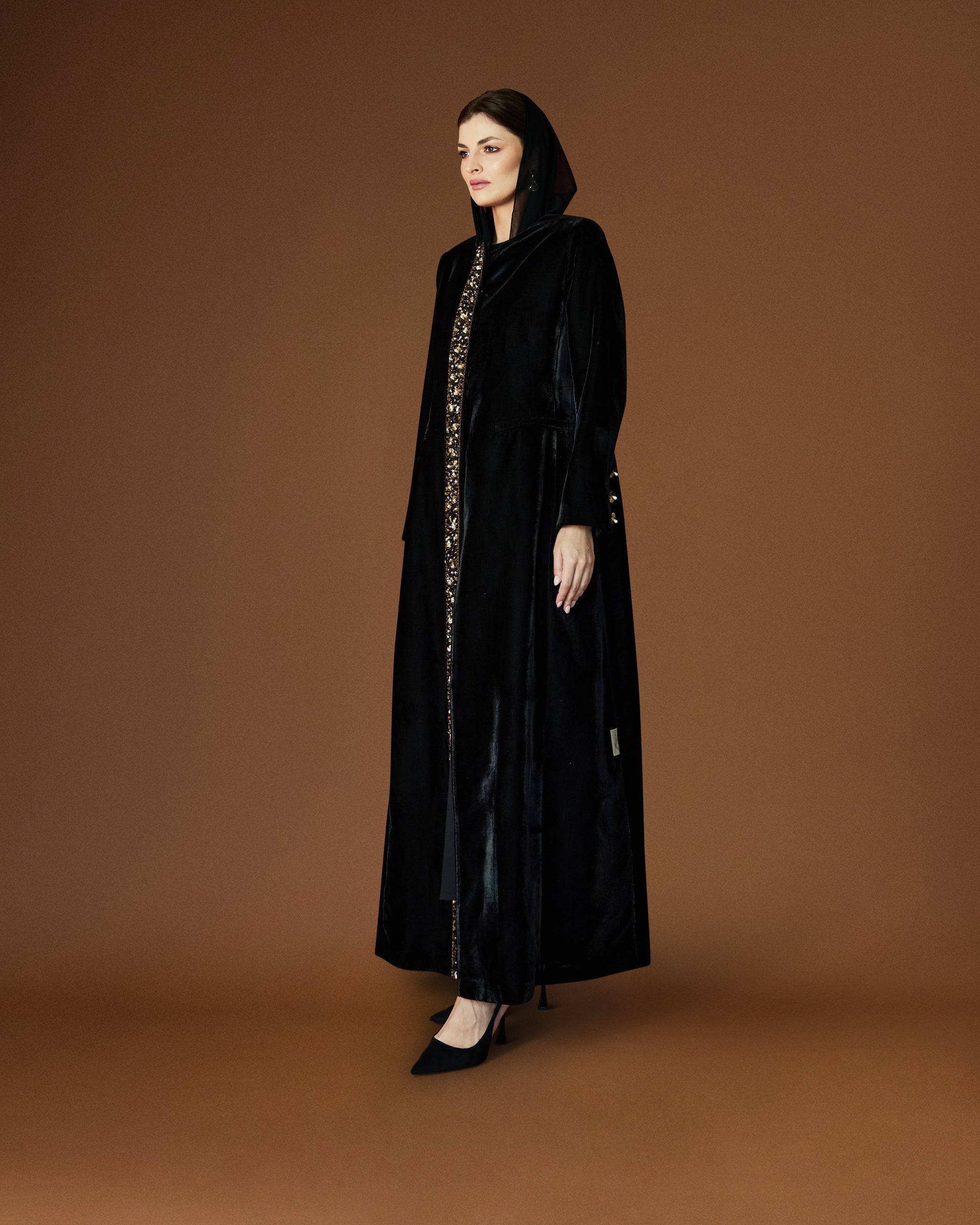 Premium velvet in the AK-07 cut, highlighted by intricate metallic detailing for a refined winter glow.