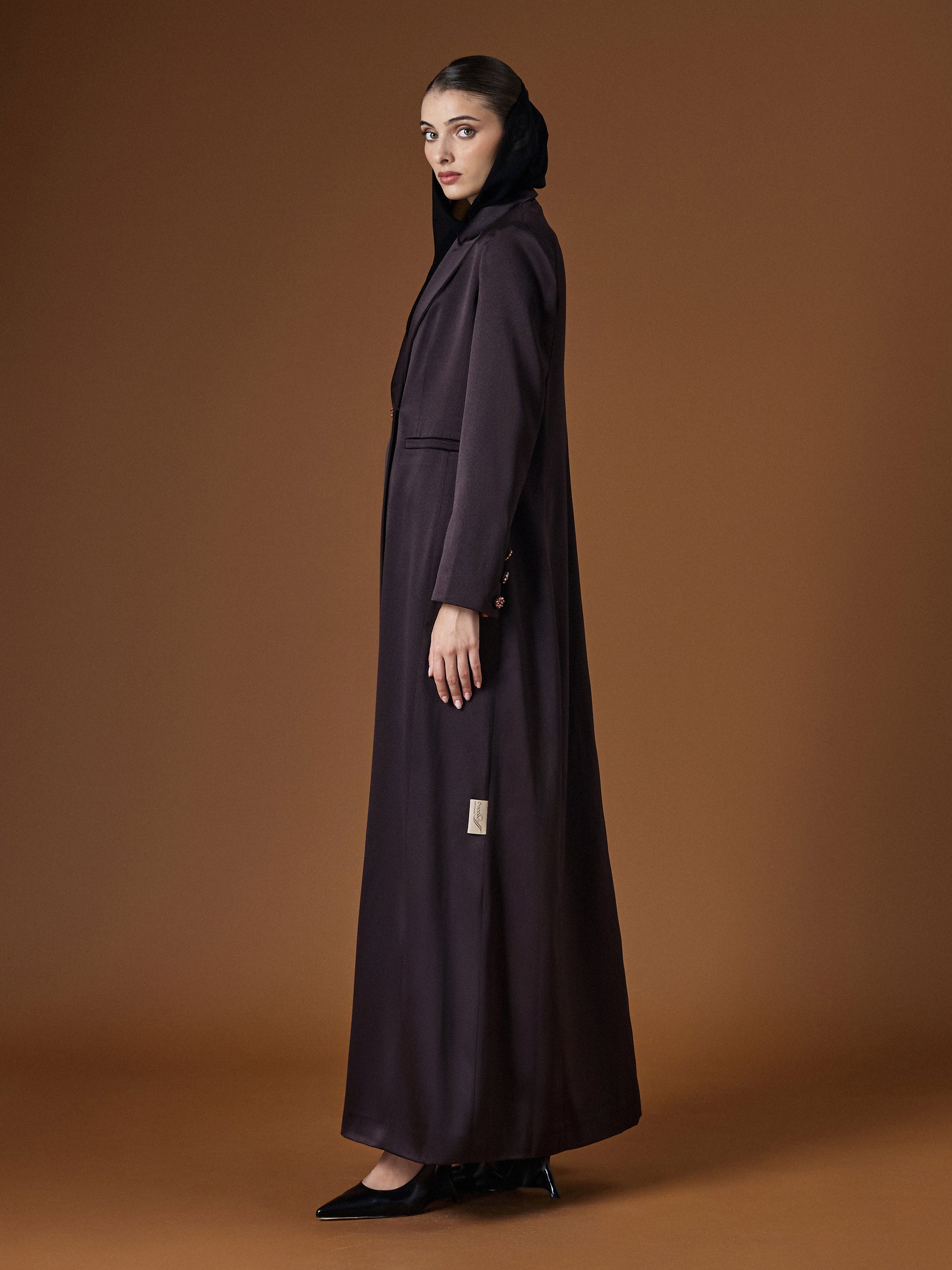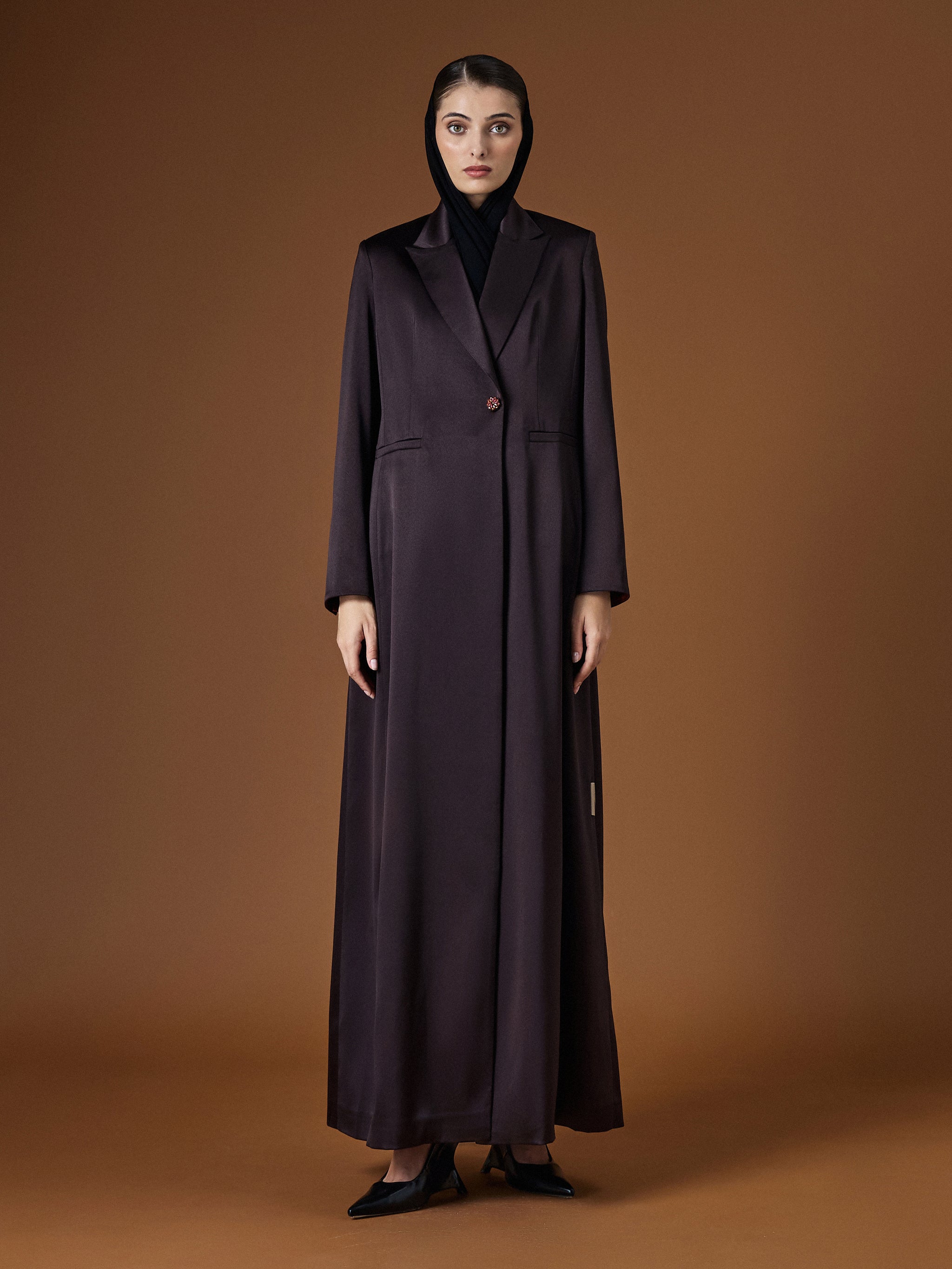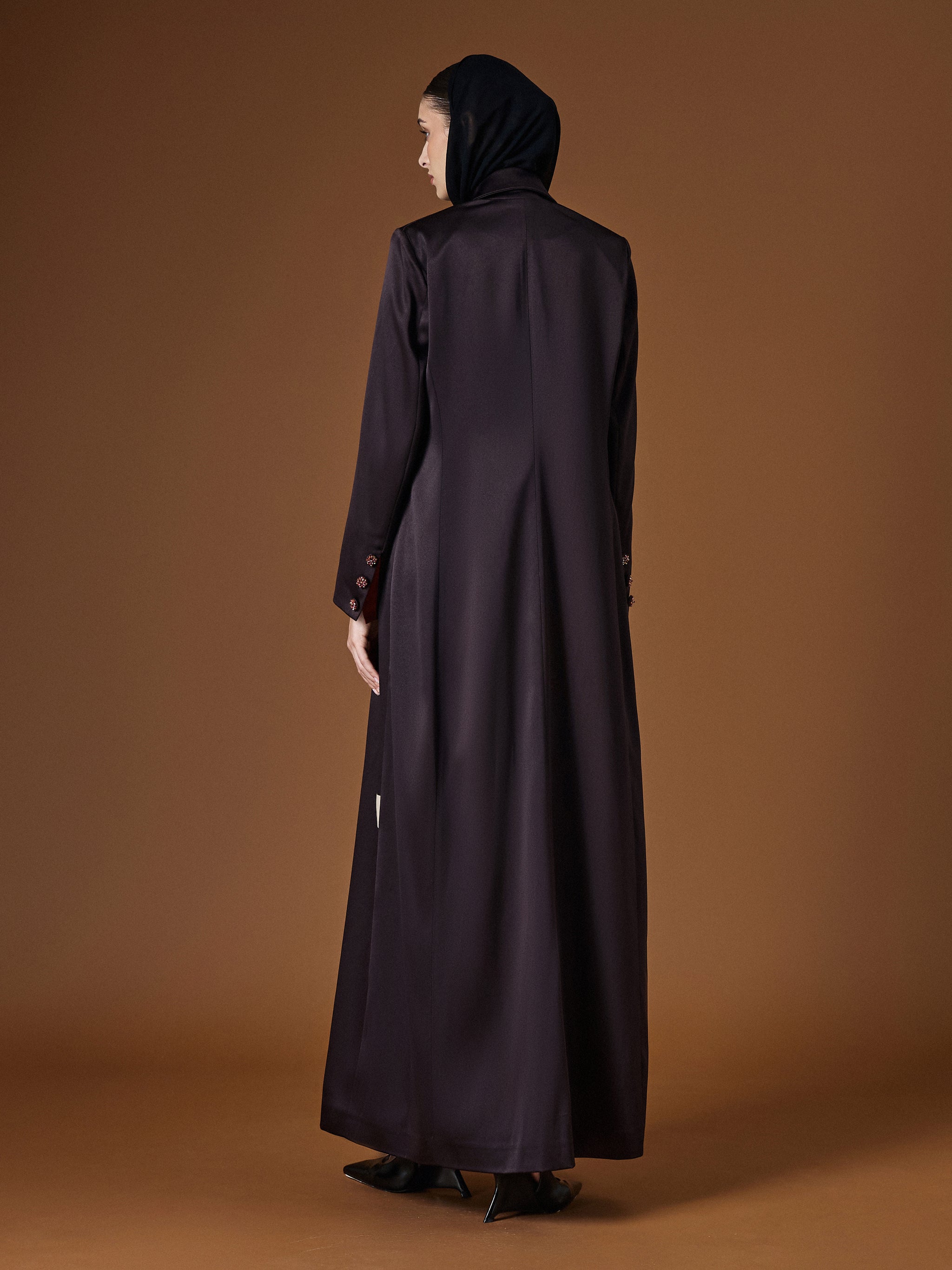 A simple and elegant taffeta abaya that blends timeless style with effortless grace.