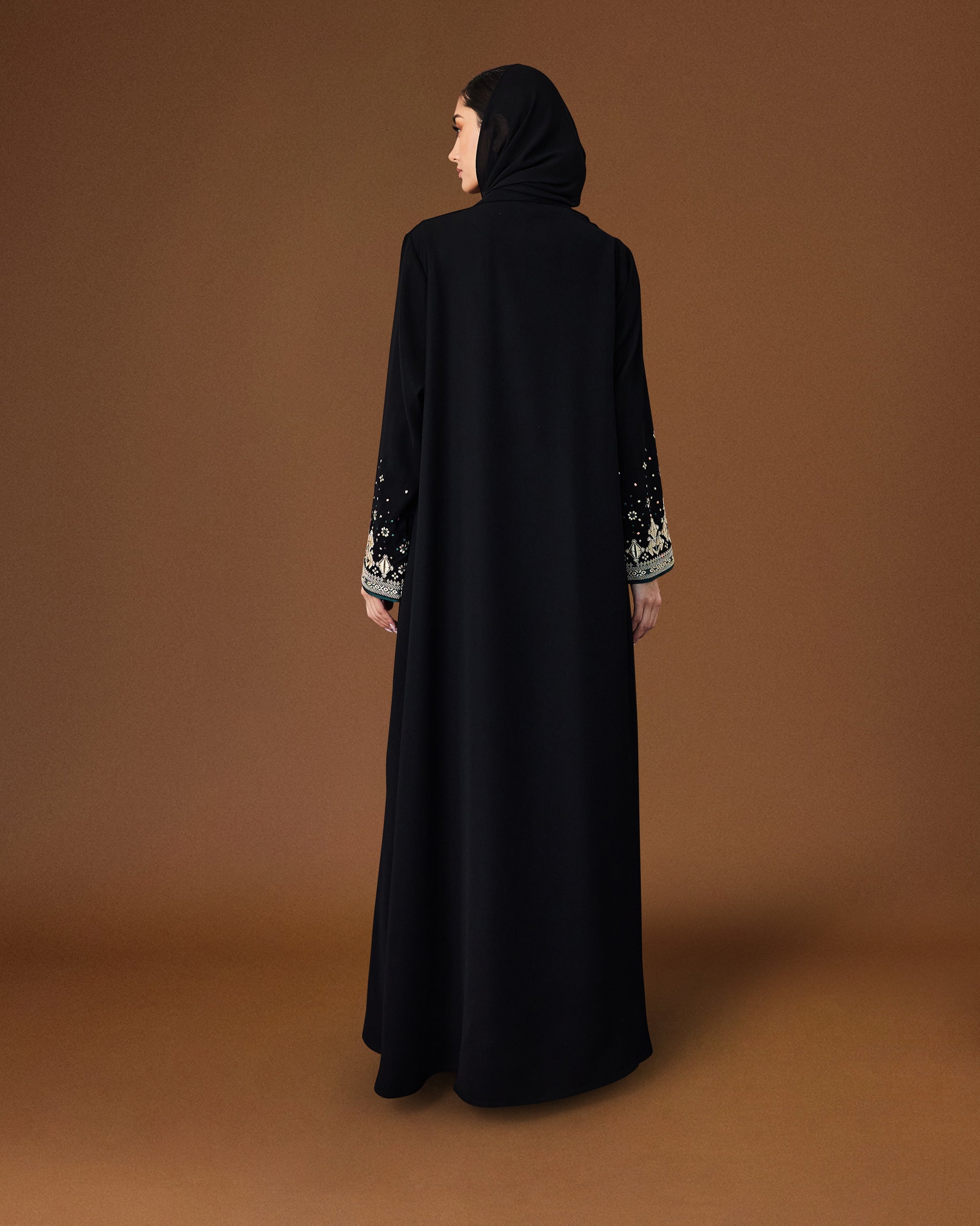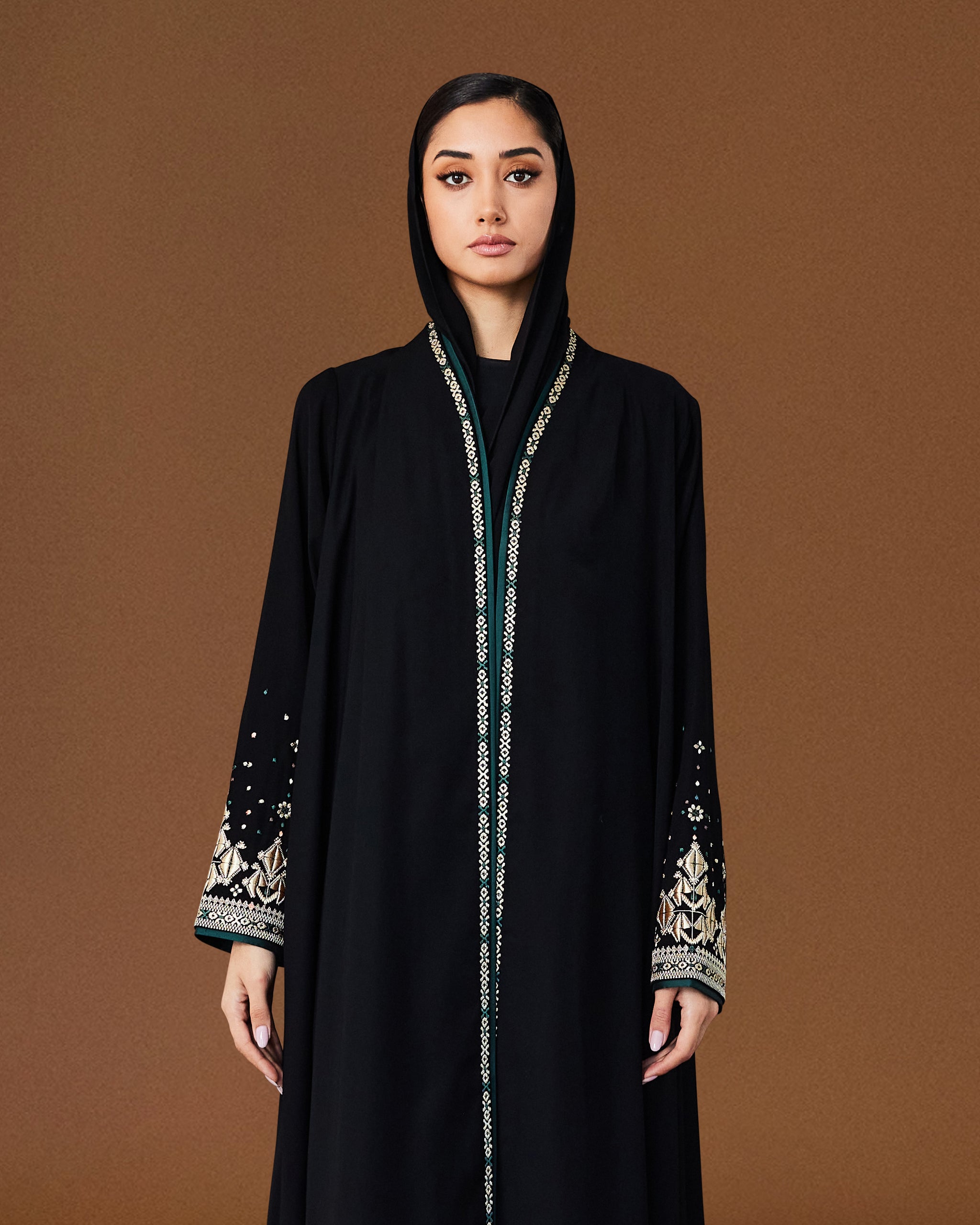 Crafted in black crepe with refined green embroidery, this AK-01 cut abaya offers a graceful, flowing silhouette. A sophisticated Ramadan piece that balances tradition, elegance, and subtle contrast.