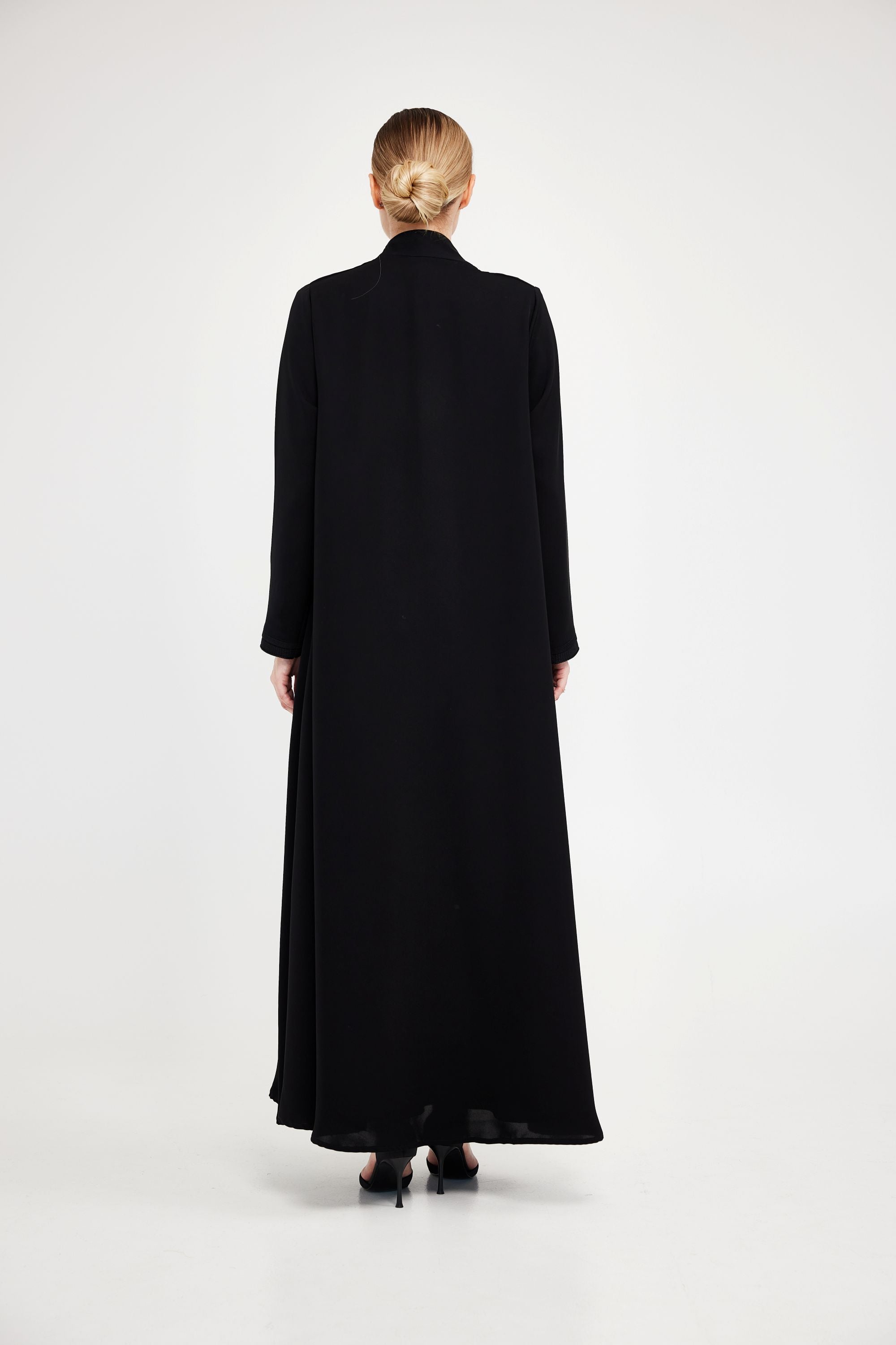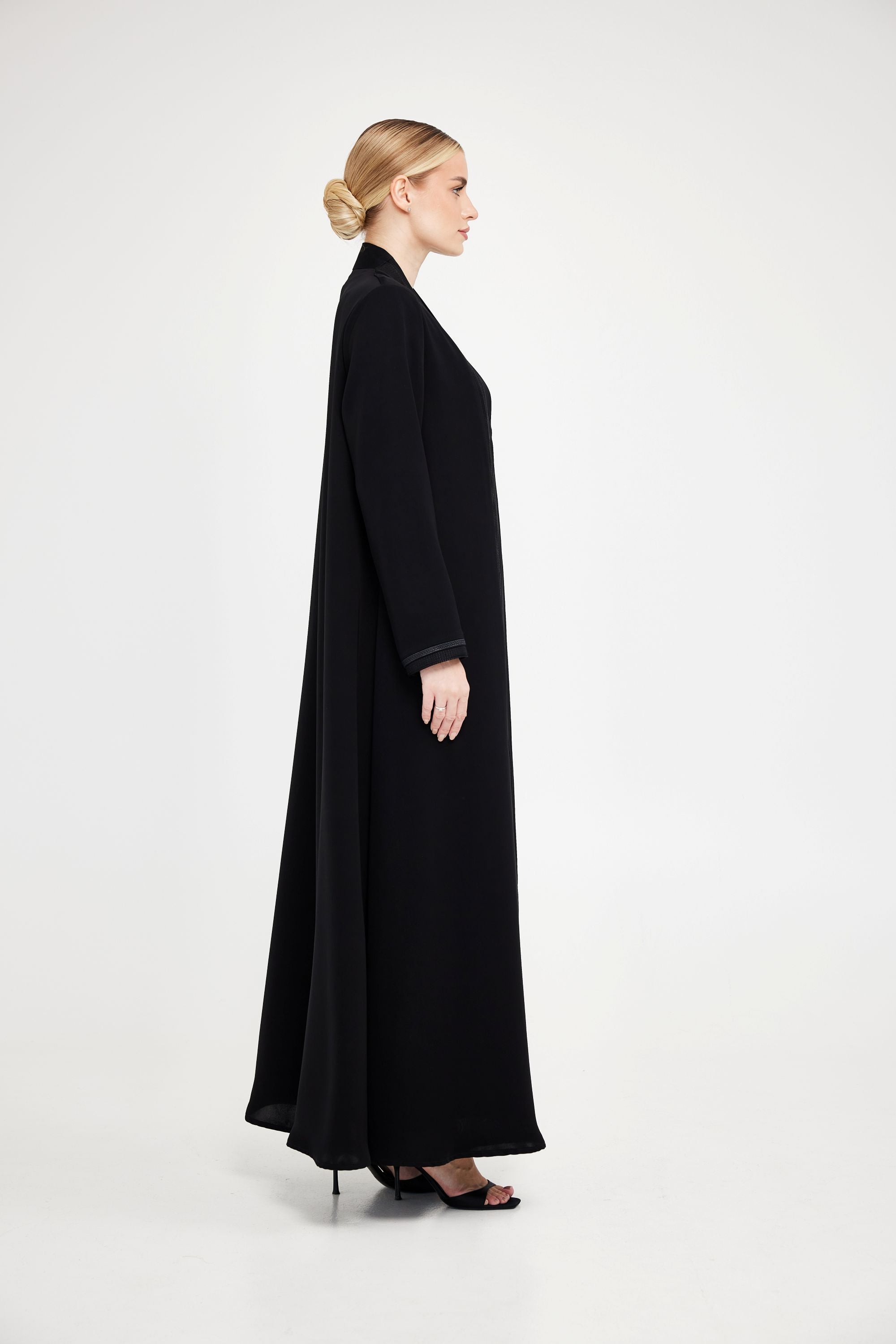 "Line Edit" is the definition of refined minimalism. Made from soft black crepe with the AK-01 cut, this abaya flows effortlessly while maintaining a composed silhouette. Delicate tonal trims frame the front and cuffs, adding just the right amount of structure to its quiet design. A timeless essential for the woman who values clarity, comfort, and understated distinction in her daily wear.