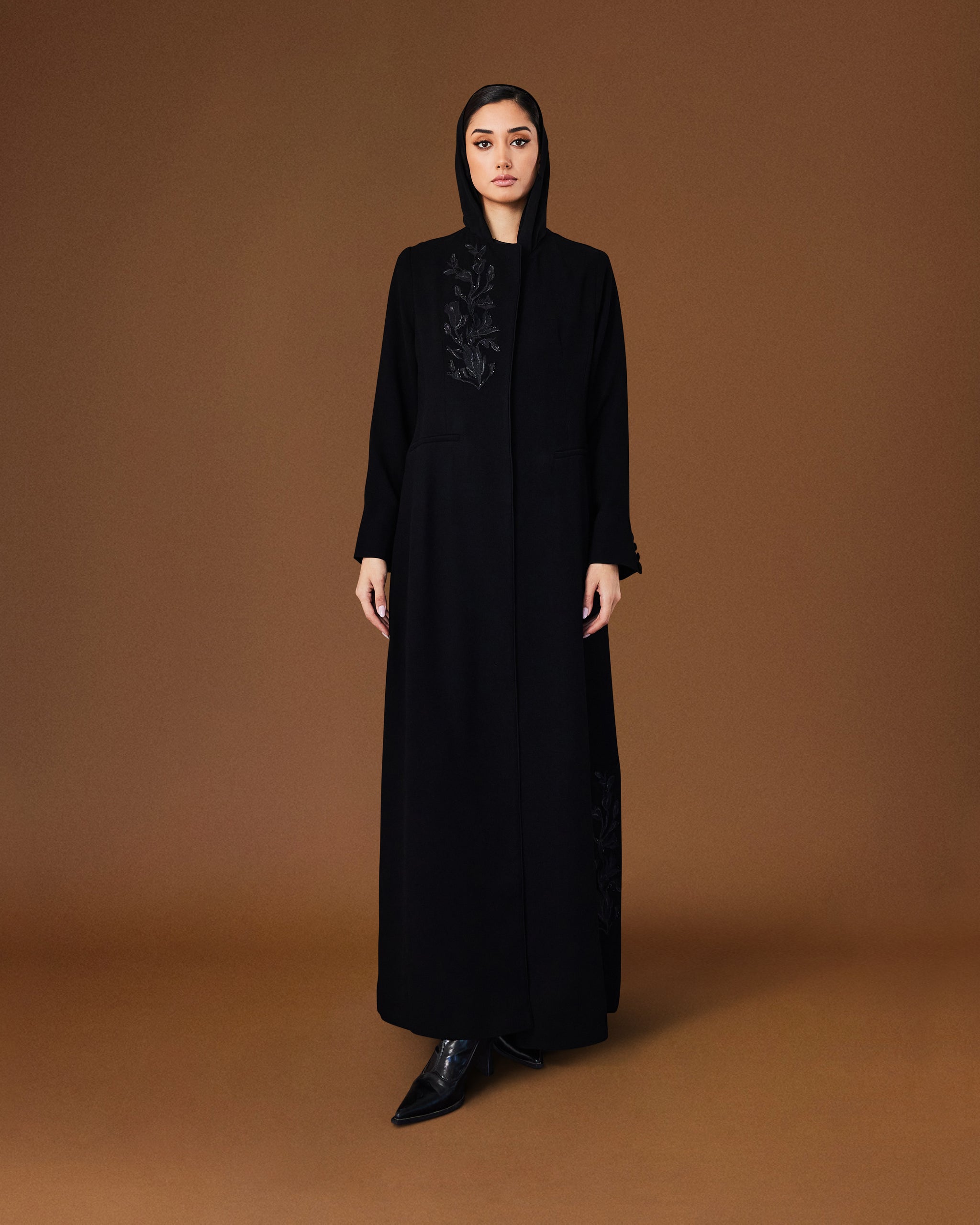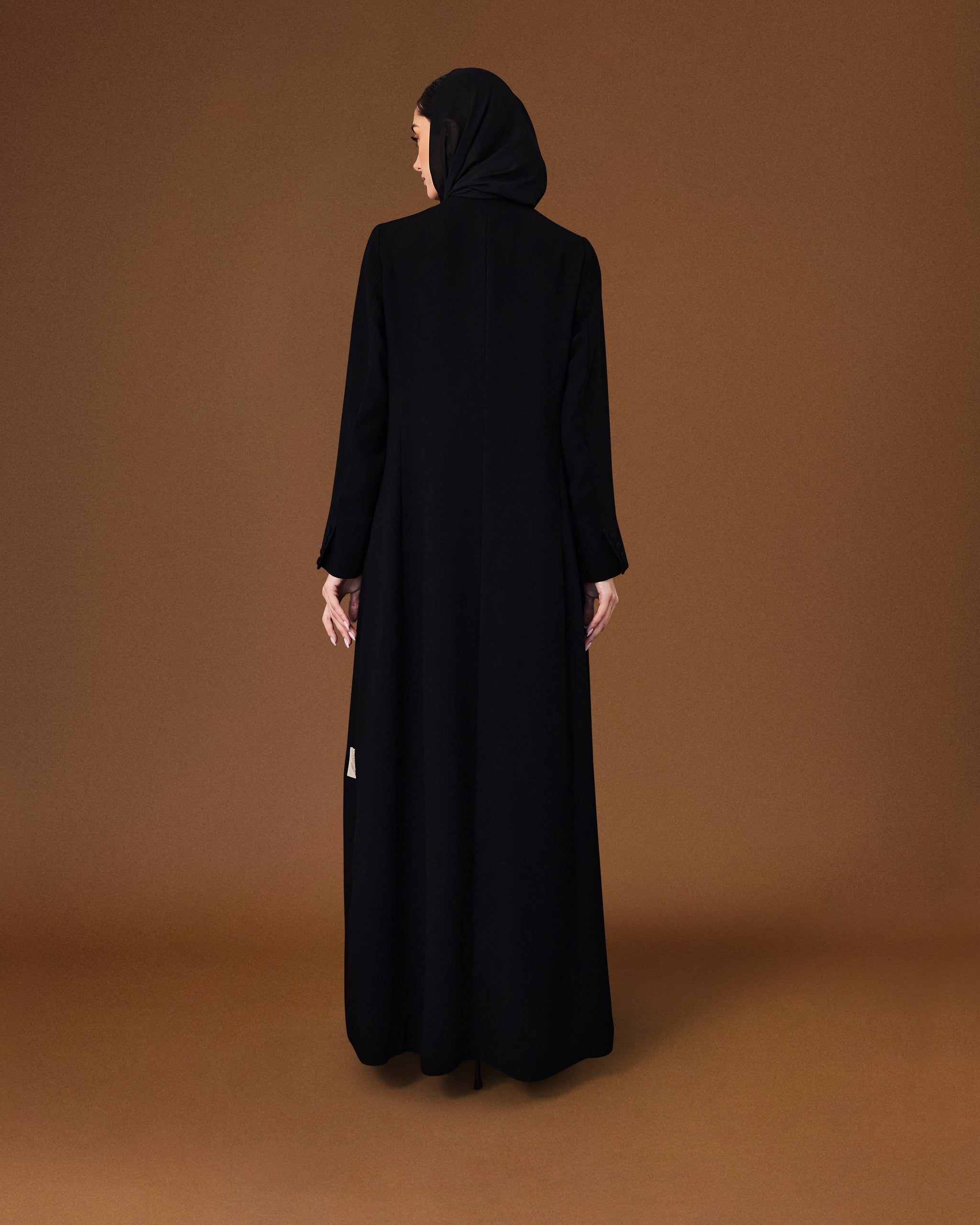 Crafted in black crepe, this AH-07 cut abaya features a sleek silhouette with delicate embroidery details. A refined Ramadan piece offering understated elegance and modern modesty.