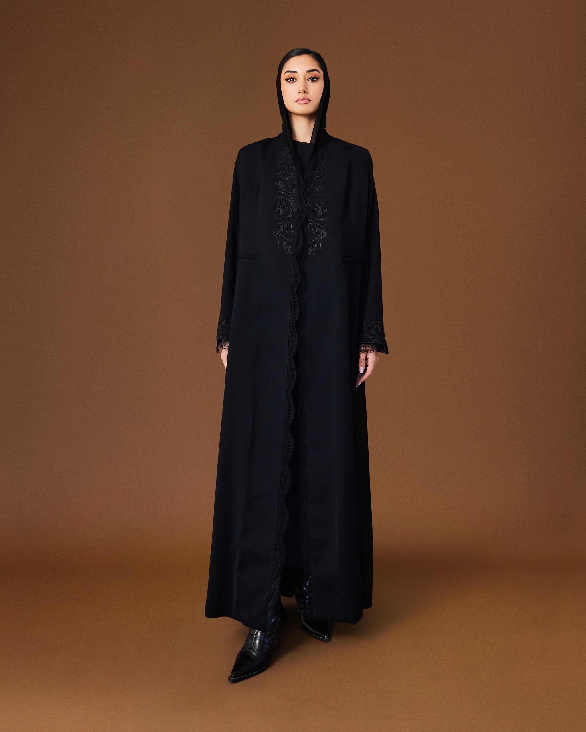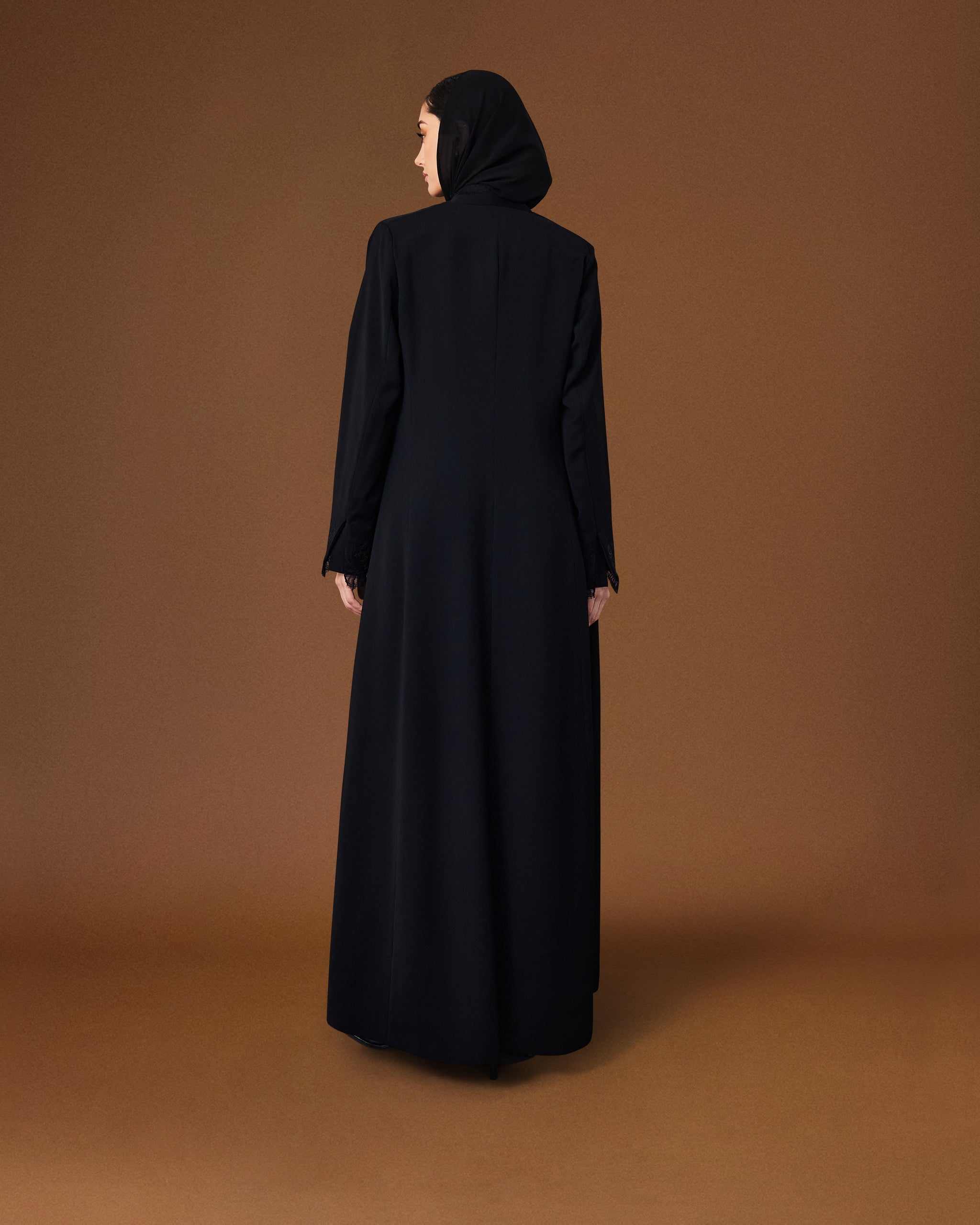Obsidian Veil is crafted from flowing black crepe in the AK-07 cut, offering a structured yet fluid silhouette. Subtle embroidered detailing adds depth and restraint, while the elongated lines create an effortlessly polished look. A timeless piece that embodies quiet strength and refined elegance.