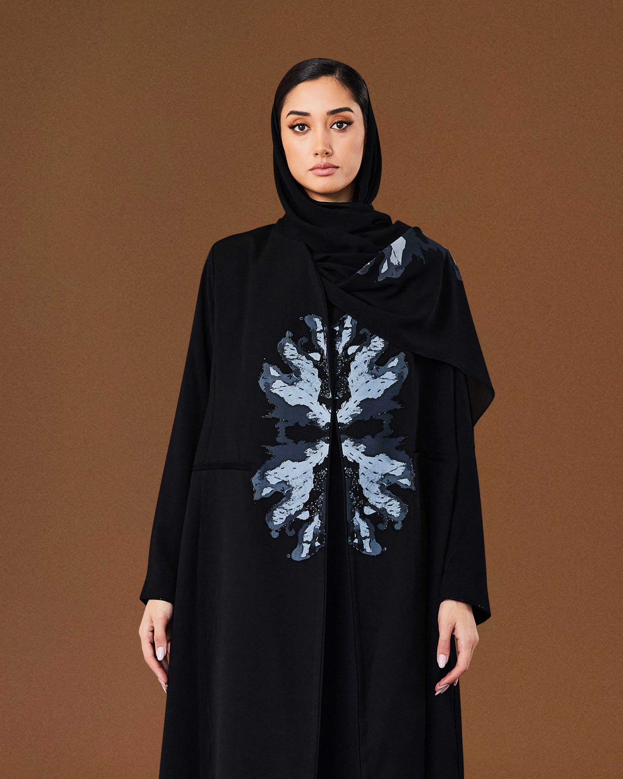 Crafted from printed crepe in black and grey tones, this AK-07 cut features a flowing silhouette with subtle central detailing, offering composed elegance for serene Ramadan evenings.